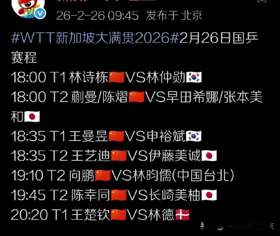 2月26日,新加坡大满贯赛的赛场上,所有的比拼都集中在了晚间黄金时段进行。而在18点档球迷们将看到的国乒球员的首场比赛是林诗栋和韩国名将林钟勋之间的交锋,这场比赛也将在1号球台上进行。而同时段在2号球台也将进行另一场女双方面的较量,那就是国乒的两位年轻主力蒯曼和陈熠,与日本女乒重点打造的组合早田希娜还有张本美和组合之间的对决。 对于这两场比赛,我们可以说对国乒三位球员的考验还是比较大的,其中林钟勋在韩国队阵中也是拥有足够的竞争力,大赛经验丰富,只不过他混双还有男双方面的能力明显优于他的个人单打实力,所以林诗栋只要自己不犯错误,战术上积极主动,遇到困难,或者说看到对方搏杀时,也能稳住心神,打出自己技战术方面的综合能力,就能在这场16进8的争夺战当中占据上风,锁定最后胜利。我们也看好他能成功晋级。而对于这场女双的半决赛来说,上一轮比赛蒯曼和陈熠在第四局3:10落后的情况下上演大逆转,实现13:11的逆转胜出,确实给人留下深刻印象,但显然韩国组合的实力与这对日本女乒重点打造的搭档张本美和早田希娜相比小有差距,所以这场比赛对于蒯曼和陈熠的考验极大。如果说哪对组合更有机会晋级,双方胜率基本相当,日本组合稍稍占优。 18:35分,在T1和T2球台两位国乒女队的主力王曼昱和王艺迪则将在16进8的争夺战当中同时迎来两位日韩高手的挑战。其中王曼昱将在1号球台迎来与 韩国一姐申裕斌之间的交锋,王艺迪则将在2号球台迎来伊藤美诚的挑战。 实事求是的说,在当下的世界女子乒坛,申裕斌已经算是一个综合能力很强而且战术思路也较清晰,在场上应变能力同样非常突出的实力派球员,所以她注定会给王曼昱带来很大的竞争压力,比赛也会打的紧张激烈,但是我们还是相信王曼昱能凭借自己的技术厚度还有综合实力优势拿到比赛的最后胜利。 至于,王艺迪和伊藤美诚的对决,即使伊藤美诚曾经达到的高度要优于王艺迪,但王艺迪如果像前面两轮比赛那样始终保持场上攻防的稳定性,并把自己连续进攻的优势发挥出来,把伊藤美诚斩落于马下,锁定一个女单八强名额同样有极大概率。 19:10分左右,向鹏将在一号球台迎来与中国台北名将林昀儒之间的对决。显然,林昀儒近期综合实力不断提升,技术革新之后整体竞争力也有新突破,他在世界赛场上已经把多位世界高手挑落于马下,因此对于向鹏来说,本轮晋级男单八强的难度不小——但对于向鹏来说,也不是一点机会没有,关键还是要把自己的技术特点发挥出来,同时要尽量不给林昀儒霸王拧的机会,要争取率先上手,率先抢攻,如果能在主动性和遇到多板对攻之后的防守韧性方面处理得当,向鹏也有三到四成取胜可能性。 晚间19:45分,陈幸同作为国乒女队的另一位主力球员则将迎来日本另一位美女高手长崎美柚的挑战。总的来讲,近期长崎美柚在原来有一段时间停步不前的情况下重新呈现出涨球速度迅猛的状态,在世界赛场上也多次把一些世界名将,包括国乒的部分主力球员挑落于马下。所以对于这场比赛,陈幸同一方面是要处理好进攻的主动性问题,另一方面也要在出手稳定性方面有所提升,只要陈幸同打出自己的实力厚度,不管是轻松胜出还是比分胶着,都能在场上保持心态稳定性,那么陈幸同就能依靠自己的实力厚度来拿到比赛胜利和一个女单八强席位。 另外,这个比赛日当中最晚登场的国乒球员是男队的另一大主力王楚钦。本轮面对来自丹麦的高个子球员林德,对于王楚钦来说也是一大挑战。毕竟他在前面的比赛当中虽然看起来赢得比较轻松,但是也在一些关键球的处理上出现了一些失误送分或者场上被出示黄牌的情况,所以他在这场与林德的较量当中还是需要把技术细节抠的更细一点,同时在遇到对方强势挑战时,还要找到合理的战术来按照自己的节奏走。处理好了这两点,相信王楚钦即使会遇到一定的挑战,仍然可以在林德面前实现胜出晋级的目标。 那么您对我们的这种基本预判有何观点、看法?也欢迎朋友们给出自己心中的解读,大家共同交流探讨。