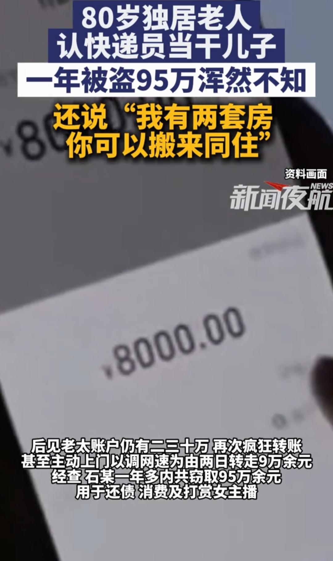 痛心!独居老人认快递员当干儿子,95万养老钱被掏空 近日,上海八旬独居老太认快递员当干儿子,却被偷走毕生积蓄95万元,事件曝光后全网愤怒。 老人无子女陪伴,常年独居倍感孤独。快递员石某日常送货时嘘寒问暖,帮着跑腿、操作手机,让老人倍感温暖,主动认作干儿子,甚至邀请他搬来同住,毫无防备之心。 一次网购时,老人随口说出支付密码,被负债累累的石某默默记下。他从0.1元试探转账,发现老人不设防后愈发猖狂,以调网速、帮买菜为由频繁上门,蚂蚁搬家式转走钱款,最多两天转走9万。 95万最终被用于偿还高利贷、个人消费、打赏女主播,直到账户异常老人才察觉。更让人心酸的是,案发初期,老人仍对这位“干儿子”深信不疑。 透过现象看本质:这不是简单盗窃,而是一场情感掠夺。骗子抓住的不是密码漏洞,是独居老人的孤独与信任。老人缺的不是服务,是陪伴;被骗的不是钱财,是真心。 老龄化社会,独居老人的情感空白,正成为骗局高发区。比起反复提醒防骗,子女多一通电话、多一次回家,才是最坚固的防线。 别让孤独,成为伤害老人的利器。上海空巢老人 上海阿姨被骗案