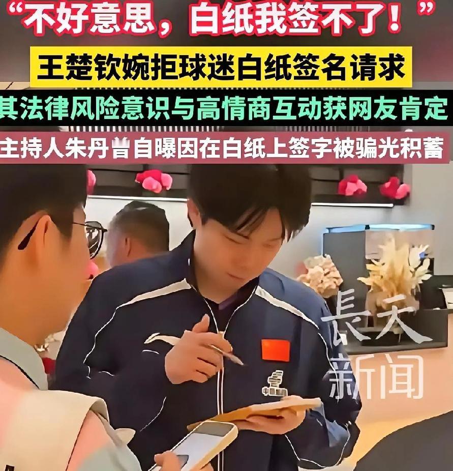 为什么王楚钦敢签封面却拒签白纸?学到了! 新加坡WTT现场, 王楚钦说“白纸我签不了”, 最后给粉丝签在了本子封面上。 这波操作又稳又宠粉,太圈粉了! ❓ 为啥白纸不能签? 白纸上签字其实很危险! 相当于给别人一张“空白授权书”,人家之后随便填上借条、合同, 分分钟让你背锅。 ❓ 为啥封面就没事? 封面就是个实物呀,有固定用途,不可能被当成法律文件。签在这儿就是留个纪念,完全没风险。 💡 聪明处理 他没直接怼粉丝, 而是温柔解释,主动换封面。 既守住法律底线, 又没让粉丝失望, 这情商真绝!