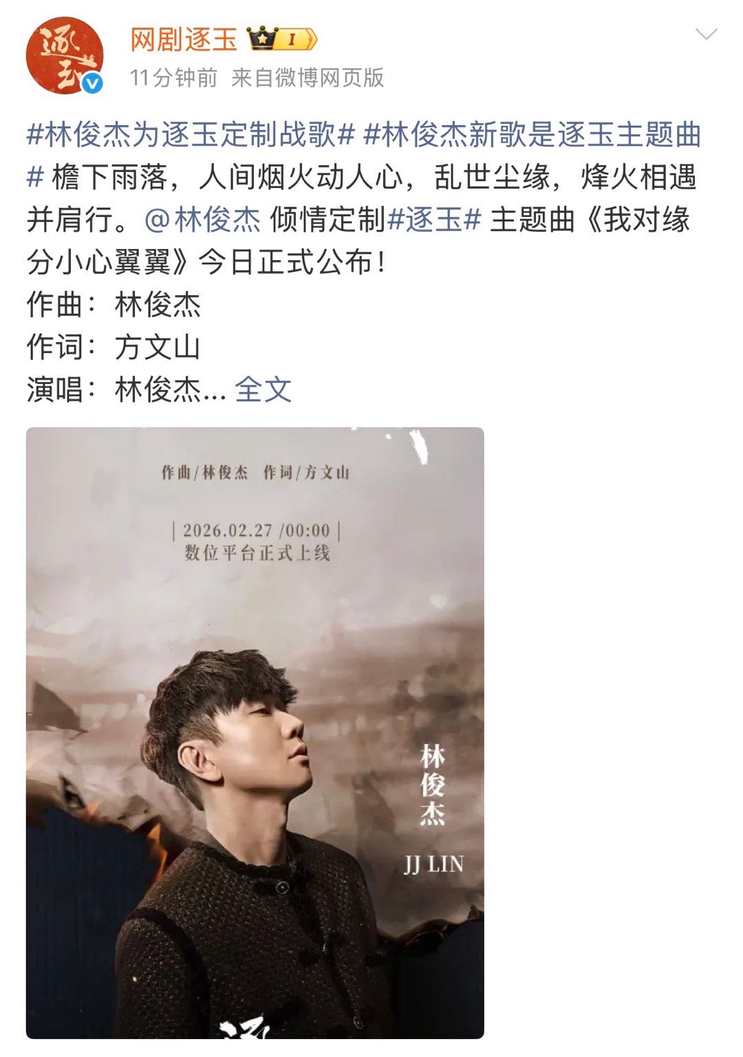 林俊杰为逐玉定制战歌张凌赫田曦薇《逐玉》主题曲太顶了吧,林俊杰作曲演唱,方文山作词,太期待了