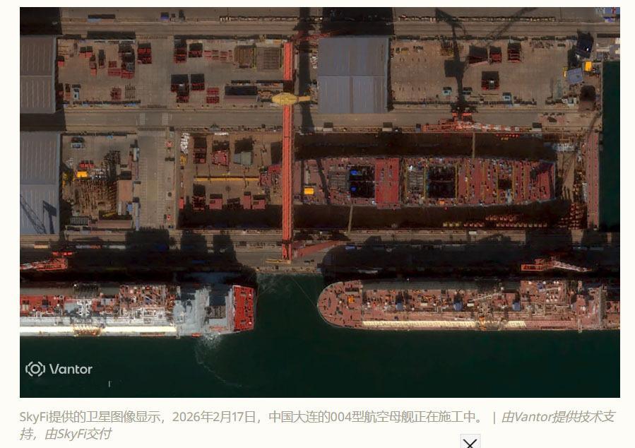 美《新闻周刊》发文称新卫星图像显示,中国第四艘航空母舰的建造工作正在推进。国防分