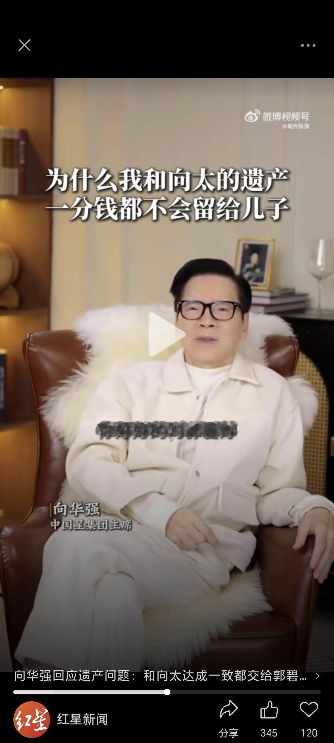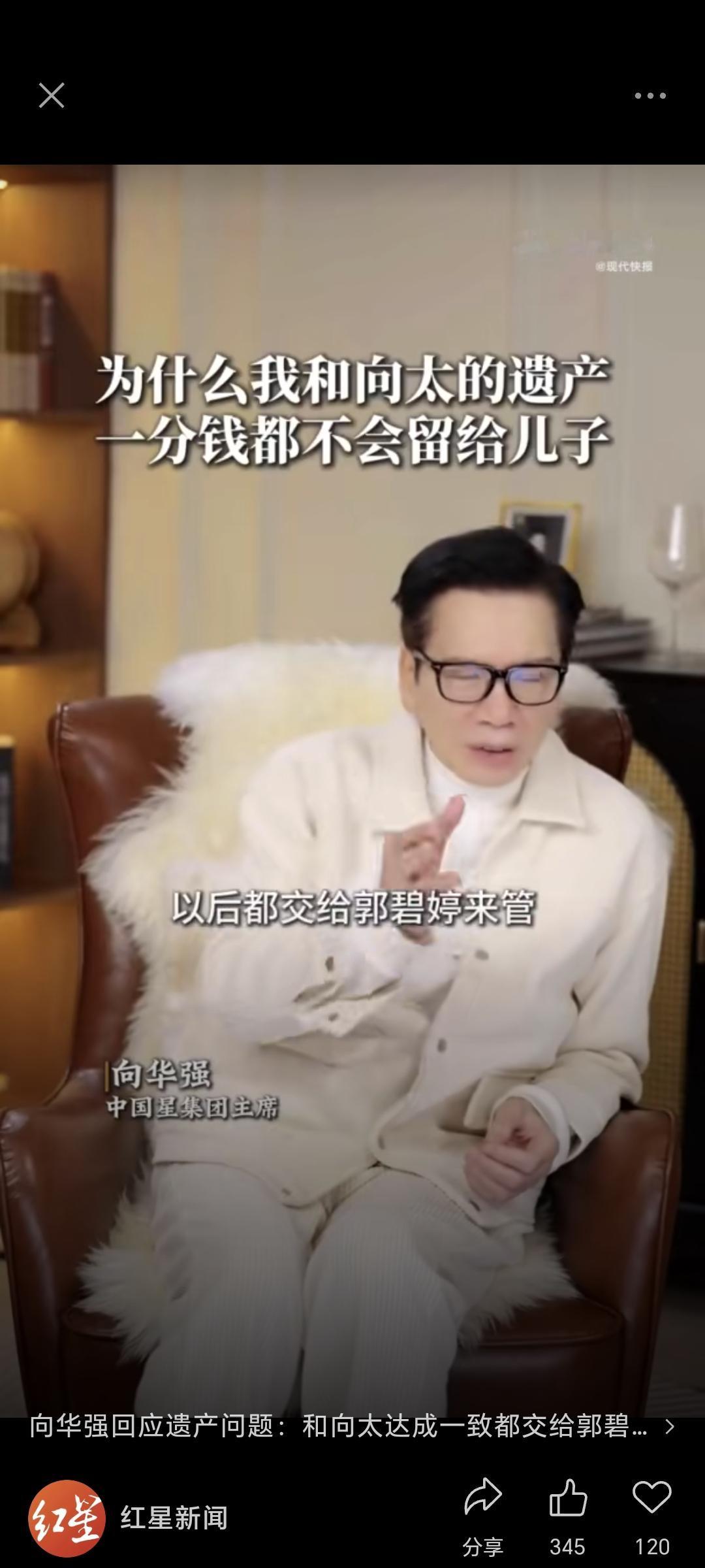 向太家到底有多少财产,都交给郭碧婷?77岁向华强又上镜了,这次大方回应自家的财产管理问题。 视频里多次提到儿媳货币体力,当然还有两个儿子。公公直接说,所有遗产交给郭碧婷处理。 向华强又谈及小儿子向佑,并透露已和向太达成一致,遗产都交给郭碧婷来管,一分钱不留给儿子。 开始,他说财产不给儿子,还以为只是向佑。但是话锋一转,原来向佐也在其中。 向家会成立基金会,所有钱财、生意归郭碧婷打理。因为两个儿子都不省心,会乱花钱,成败家子。 当爹说,此举让小儿子向佑直喊不公平,向太也早就心灰意冷将向佑微信拉黑删除。 结果,当爹的也没有他的微信,只有向佐还保留弟弟的微信。向佑想见父亲和母亲,还得联系秘书。 有人问向家的矛盾为何发展到今天这样的地步?向佑的叛逆和年轻时的荒唐,让父母狠下心来,不给他遗产。 当年他出手伤人,出言不逊,欺行霸市,还染指赌博,父母为其擦屁股不知道花了多少钱。最后,向太狠下心来,没有再去管他。 郭碧婷为何如此讨向太的欢心?郭碧婷去年很少露面,多数时间在台湾,被传与向佐感情破裂。 向太经常出来力挺,还说郭碧婷给家里的钱都是她自己赚的。言外之意,郭碧婷嫁入向家是两情相悦,没有背后向家财富的施压。 郭碧婷是情商与智慧,美貌都并存的女星,而且很节约,没有一点架子。关键是,她嫁进来也没有乱花向家的钱。 就算自己娘家有事,父亲病重,所有开销也都是她自己赚的钱。 所以,做豪门儿媳,郭碧婷确实人生不二人选。 那么,向家到底有多少家产?有媒体估算过,向华强这几十年来投资房产、影视等,少说也有 500 亿。 看现在郭碧婷不回香港住,一直住台湾,感觉未来向家谁做主还不明朗。 不过,也有人感觉向太这次是为了气向佑而说出来的气话? 向太和和丈夫每次发声说家里的事,都会带上郭碧婷,感觉有些刻意为之。 豪门家事,谁也看不透。大家还是希望家和万事兴。