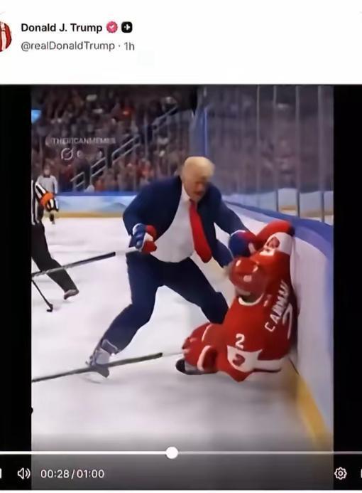 流氓至极! 美国总统老特是真没底线,当地时间 2 月 23 日,他在自己的社交媒体上,发了一段 AI 合成的视频。 视频里演的是米兰冬奥会冰球决赛,特朗普亲自化身美国冰球队员,在赛场上横冲直撞,不仅撞翻加拿大球员,还脱下手套赤手空拳殴打对方,最后自己“进球”帮美国队拿下胜利。这段视频一看就是假的,西装革履打冰球,AI生成的痕迹明显,但他根本不在乎真假,要的就是羞辱加拿大的效果。 这事得从头说起。2月22日,米兰冬奥会男子冰球决赛真打了,美国队通过加时赛,以2比1险胜加拿大队,时隔46年再夺这个项目的奥运金牌。 体育比赛输赢本是常事,可美国偏不按常理出牌。夺冠第二天,白宫官方账号先发了一张图:一只白头鹰正猛扑一只加拿大鹅。白头鹰是美国的象征,加拿大鹅是加拿大的象征,这张图的挑衅意味再明显不过。 白宫还特意转发了加拿大前总理特鲁多2025年说的一句话。当时加拿大在另一场冰球赛中赢了美国,特鲁多发文回击特朗普“加拿大应成为美国第51个州”的言论,写道:“你们夺不走我们的国家,也夺不走我们的国球。”白宫这是旧账新账一起算,用图片隔空打脸。 图片发完,特朗普本人亲自下场,祭出了那段AI视频。这已经不是简单的庆祝胜利,而是把体育竞技场变成了数字斗殴场,把国家间的外交互动降格为街头混混式的霸凌。 特朗普这么做,绝非一时兴起,背后全是政治算计。自他2025年重新上任以来,美加关系就急转直下。他多次公开宣称要让加拿大成为美国的第51个州,这已经不是玩笑,而是带有吞并色彩的政治威胁。 2025年2月,他签署行政令,对所有加拿大输美商品加征25%的关税,对加拿大石油加征10%的关税。美加年贸易额高达2.1万亿美元,这一刀砍下去,加拿大经济必然内伤。他还威胁要阻挠连接两国的重要桥梁——戈迪·豪国际大桥的开通。据密歇根州一家咨询公司报告,这座桥若推迟开通,每周将给加拿大造成700万加元的经济损失。 冰球是加拿大的国球,在冬奥会上击败加拿大,对特朗普来说是天赐的政治作秀良机。他发布AI视频,一石三鸟:第一,继续向加拿大施压,展示其“强硬”姿态;第二,讨好国内保守派和体育迷,巩固基本盘;第三,转移国内对其施政不力的批评焦点。他以为这种简单粗暴、充满暴力和羞辱的方式能彰显“强大”,却不知这恰恰暴露了其流氓底色和美国的霸权焦虑。 国际社会的反应给了他一记响亮的耳光,加拿大英属哥伦比亚大学政治学教授斯图尔特·普雷斯顿直接在社交媒体上回帖,要求美国“保持风度”。全球网友更是炸开了锅,纷纷批评此举“缺乏风度和体育精神”,是把美国变成了“校园恶霸”,而加拿大成了被堵在墙角的孩子。就连美国国内也有不少声音认为,作为国家元首,这种行为“疯了”,毫无大国格局可言。 更讽刺的对比在于,就在特朗普用AI视频宣扬虚拟暴力的同一天,现实中的美国奥运金牌得主们正在以另一种方式与他切割。美国冰球协会发言人明确表示,夺得金牌的美国女子冰球队集体拒绝了特朗普邀请她们出席国情咨文演讲的邀请。而当美国男子冰球队访问白宫时,特朗普迫不及待地戴上队员的金牌开玩笑说“我可不还给他”,这幅画面与AI视频里他抢夺胜利的姿态如出一辙,充满了廉价的表演欲。 这场风波撕下了最后一块遮羞布,它表明,美国的对盟友政策已经滑向赤裸裸的霸凌。需要你时是“最亲密的盟友”,触犯其利益或仅仅是为了国内政治需要时,就可以随时用最粗俗的方式进行羞辱。体育精神、外交礼仪、基本尊重,在“美国优先”的旗号下都可以弃之不顾。 这种做法的后果是深远的,它损害的是美国的国家信誉和软实力。当一国总统可以为了个人政治秀,公然制作并传播虚假、暴力的内容来侮辱邻国时,其所宣扬的“基于规则的国际秩序”就成了一个笑话。其他国家,无论是盟友还是对手,都会看在眼里,记在心里。 国际关系的博弈,终究要靠实实在在的互信与合作,而不是靠一段漏洞百出的合成视频。这场数字斗殴,打不赢真正的比赛,更打不出一个受人尊敬的大国形象。