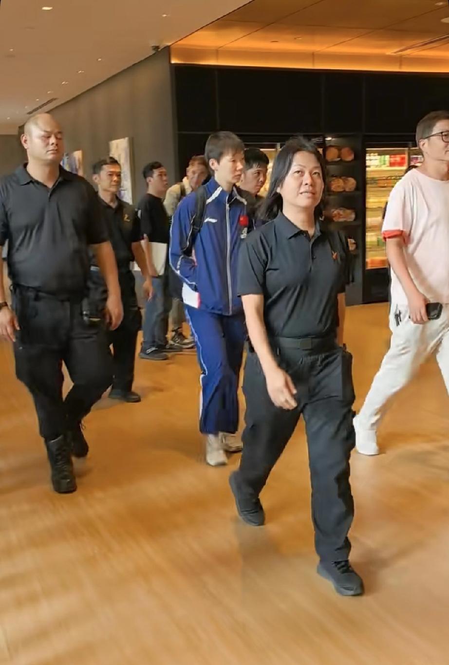 WTT新加坡大满贯,王曼昱今日酒店出发,准备前往比赛场馆训练,备战晚间场比赛。 虽然咱也是不明白到底为啥这次酒店安保这么体贴,直接给曼昱一个人安排了五个安保人员,两个前面开路,一个后面垫后,两个围住侧翼。全方位360度环绕保护运动员安全。这声势实在太浩大了! 不过,还是感谢酒店如此贴心的保障运动员安全! 曼昱今日比赛加油!