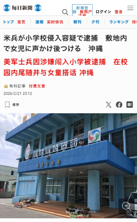 2026年2月21日,冲绳北部一所小学出了这么一档子事:一名驻日美国海军陆战队士兵,疑似喝醉了,大摇大摆闯进校园,跟一个小女孩搭话不说,还一路尾随。校方吓得赶紧报警,警方把人抓了,这士兵一开始说"想看风景",后来改口说"不太清楚"。