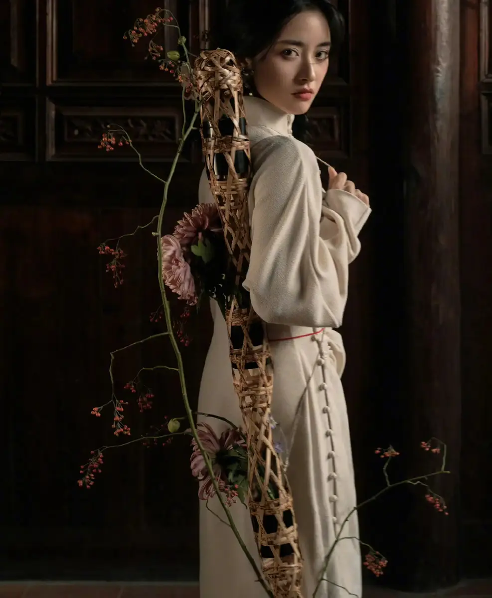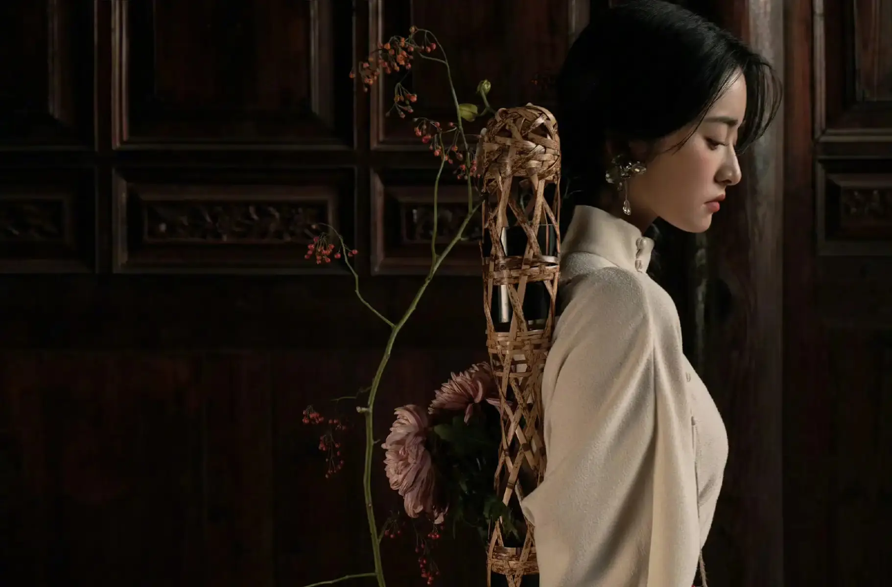 沈月背竹编花架清冷文艺 戴簪花斗笠气质干净治愈