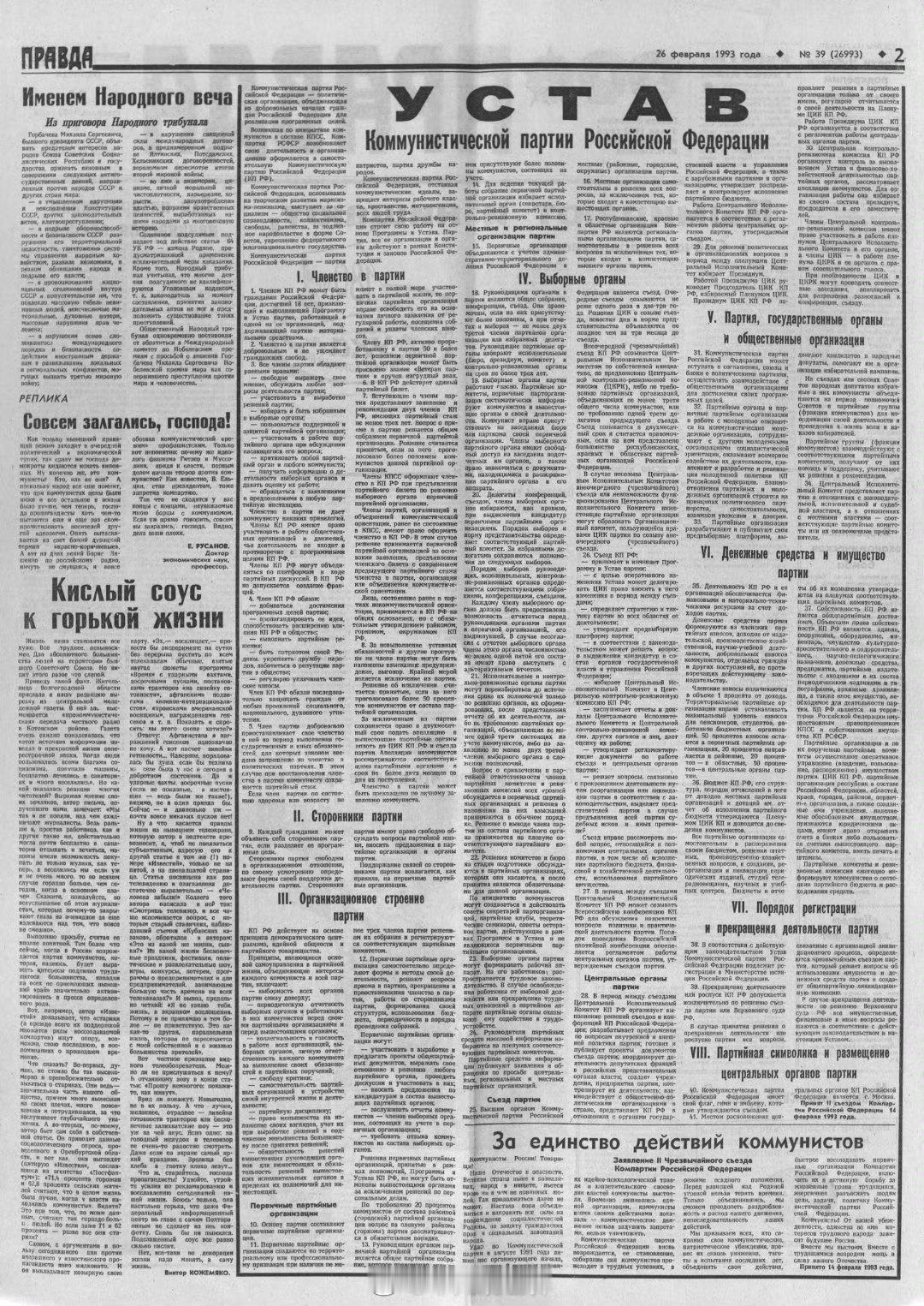 🔴 1993年2月26日,《真理报》公布了俄罗斯苏维埃联邦社会主义共和国共产党第二次特别代表大会于1993年2月14日所通过的《俄罗斯联邦共产党章程》平凡观世界КПРФ 历史上的今天