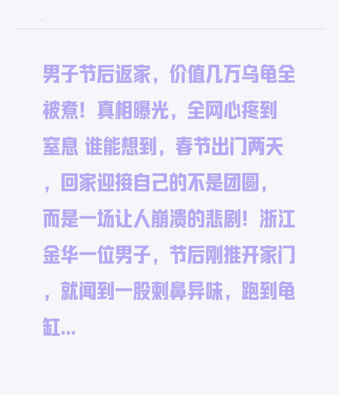 男子节后返家,价值几万乌龟全被煮!真相曝光,全网心疼到窒息 谁能想到,春节出门两天,回家迎接自己的不是团圆,而是一场让人崩溃的悲剧!浙江金华一位男子,节后刚推开家门,就闻到一股刺鼻异味,跑到龟缸前一看,当场腿软站不稳——13只心爱的宠物龟,竟全被“煮熟”了! 这批乌龟不是路边随便买的普通龟,而是男子精心养了一年多的宠物,总价值将近3-5万元,有的还是稀有品种,既是财产,更是日夜陪伴的心头肉。 他初五出门,初七就回来,短短两天,怎么会变成这样? 男子崩溃检查后发现,罪魁祸首是温控加热棒失灵。原本设定好安全温度,设备却突然故障,持续不停加热,龟缸直接变成一口“高压锅”,13只乌龟无一幸免,全部烫死,场面惨不忍睹。 一开始很多人以为是家人不懂、给炖了,转折来了,真相比被炖更让人无力。 这不是人为失误,不是恶意伤害,而是一个谁也预料不到的设备故障。男子出门前反复检查过,就怕冬天温度不够,可偏偏最放心的设备,给了他最致命一击。几年心血、几万块钱,一夜之间全部归零,换谁都接受不了。 网友们看完纷纷破防: “太窒息了,这比丢钱还难受。” “懂养龟的都知道,温控是命根子,一坏全完。” “不是钱的事,是感情真的扛不住。” 这件事也给所有养宠物、养鱼养龟的朋友提了个醒: 再贵的设备,也不能百分百放心;再精细的照顾,也怕意外突发。长时间离家,一定要装双温控、报警器、远程监控,别等悲剧发生,再后悔也来不及。 我们用心爱着的小生命,不是玩具,不是资产,是日复一日的陪伴与牵挂。愿每一份热爱都不被辜负,愿这样的意外,再也不要发生。 你养宠物遇到过最揪心的意外吗?评论区说说,提醒更多人注意安全!