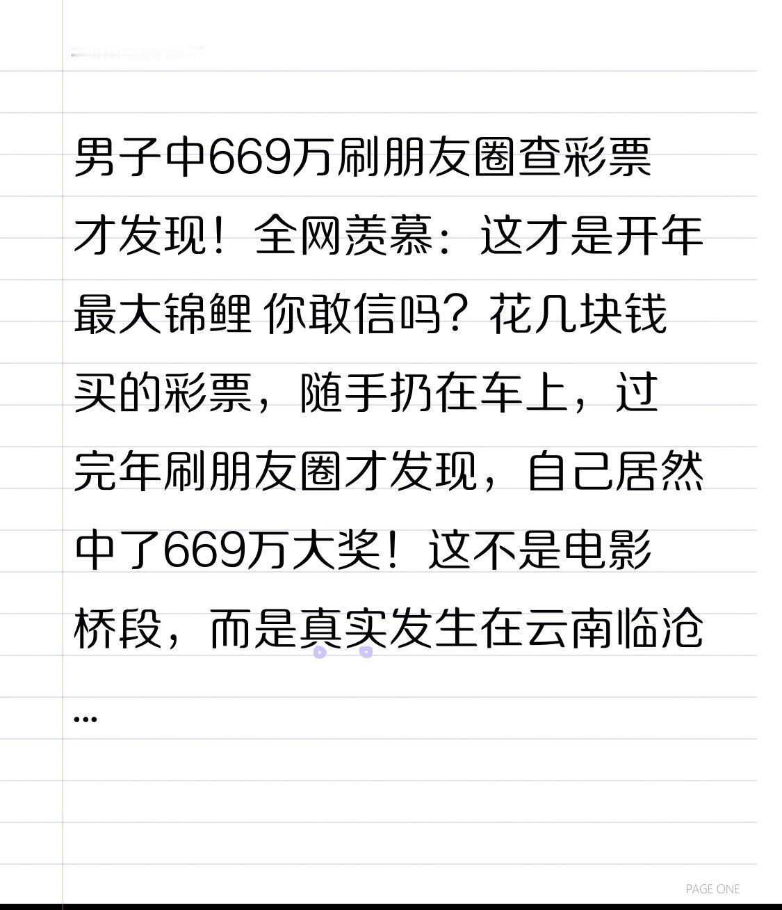 男子中669万刷朋友圈查彩票才发现!全网羡慕:这才是开年最大锦鲤 你敢信吗?花几块钱买的彩票,随手扔在车上,过完年刷朋友圈才发现,自己居然中了669万大奖!这不是电影桥段,而是真实发生在云南临沧的逆天好运,看完谁不感叹一句:老天爷追着喂饭啊! 春节前,这位男子像往常一样,顺手买了张彩票,压根没抱希望,随手往车里一扔,就忙着备年货、走亲访友,把这事忘得一干二净。开奖当天,他连看都没看,更别说核对号码。 直到年后刷朋友圈,看到有人转发:他常去的那家彩票店,中出了一注669万巨奖!他当时还羡慕地嘀咕:谁这么好运气,太旺了吧!完全没往自己身上想。 又过了几天,他上车拿东西,无意间看到那张被遗忘的彩票,抱着凑热闹的心态随手一查,整个人直接僵在原地。 转折点来了!核对完号码,他心跳直接爆表,好运砸懵了所有人。 号码一字不差,正是那注头奖!669万,真真切切砸中了他!他反复核对好几遍,才敢相信这不是梦。从羡慕别人,到主角是自己,只用了一分钟,戏剧性拉满。 更让人佩服的是,大哥领奖时特别清醒,没有飘、没有狂,规划得明明白白:先还房贷,减轻家庭压力;剩下的用来培养孩子读书,不告诉孩子中奖,不随便加零花钱,保持平常生活。 网友纷纷点赞:有钱不张扬,顾家又清醒,这才是中奖最该有的样子! 有人说,买彩票就是图个希望,大部分人都是图一乐。可这位大哥的经历告诉我们:生活总在不经意间给你惊喜。也许你随手做的一件小事,就是命运给你的礼物。 不必羡慕别人的好运,认真生活、踏实过日子的人,老天总会悄悄眷顾。 新的一年,愿我们都能保持平常心,好事不期而遇,惊喜接踵而至,说不定下一个被幸运砸中的,就是正在看视频的你!