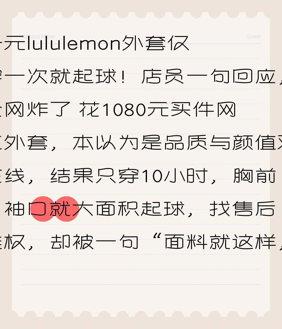 千元lululemon外套仅穿一次就起球!店员一句回应,全网炸了 花1080元买件网红外套,本以为是品质与颜值双在线,结果只穿10小时,胸前、袖口就大面积起球,找售后维权,却被一句“面料就这样,不是质量问题”怼得哑口无言。最近lululemon这件事,直接戳中无数消费者的痛点,看完太让人窝火! 西安王女士花重金入手lululemon爆款Define夹克,冲着品牌口碑和千元定价,满心期待能穿得体面又耐穿。可第一次上身,没背包、没剧烈摩擦、更没水洗,短短半天,衣服就起满毛球,好好的新衣服瞬间变得廉价不堪。她拿着衣服找门店讨说法,本以为能退换解决,没想到店员的态度彻底让人寒心。 一开始大家还以为是个例,是穿着不当导致,可转折来了,真相比想象更离谱。店员直接承认:这款Nulu面料肯定会起球,属于面料特性,不算质量问题;只要拆了吊牌,一概不退不换,甚至轻飘飘建议:介意起球就换别的款买。 更让人气愤的是,不少消费者站出来吐槽,自己也遇到同款问题,高价买的衣服穿一次就废,售后全是推诿甩锅。一边打着高端品质、极致体验的旗号,一边把明显缺陷归为“特性”,把售后责任推得一干二净,这波双标操作,彻底点燃网友怒火。 千元定价,买的不该只是品牌溢价,更该是对应的品质与服务。面料会起球不是错,错在不提前明确告知,错在出了问题不解决,错在把消费者的信任当成理所当然。我们愿意为好产品买单,但不愿为敷衍和傲慢交智商税。 这件事也给所有消费者提了醒:高价不等于高品质,品牌光环不能当质量保障,买东西别被网红效应冲昏头,看清材质、问清售后,才是最实在的保障。 也希望品牌能明白:口碑是靠品质和诚意攒出来的,不是靠傲慢与推诿消耗的。别让一次售后冷漠,寒了万千消费者的心。 你买过高价却踩雷的衣服吗?评论区说说你的经历,帮更多人避坑!