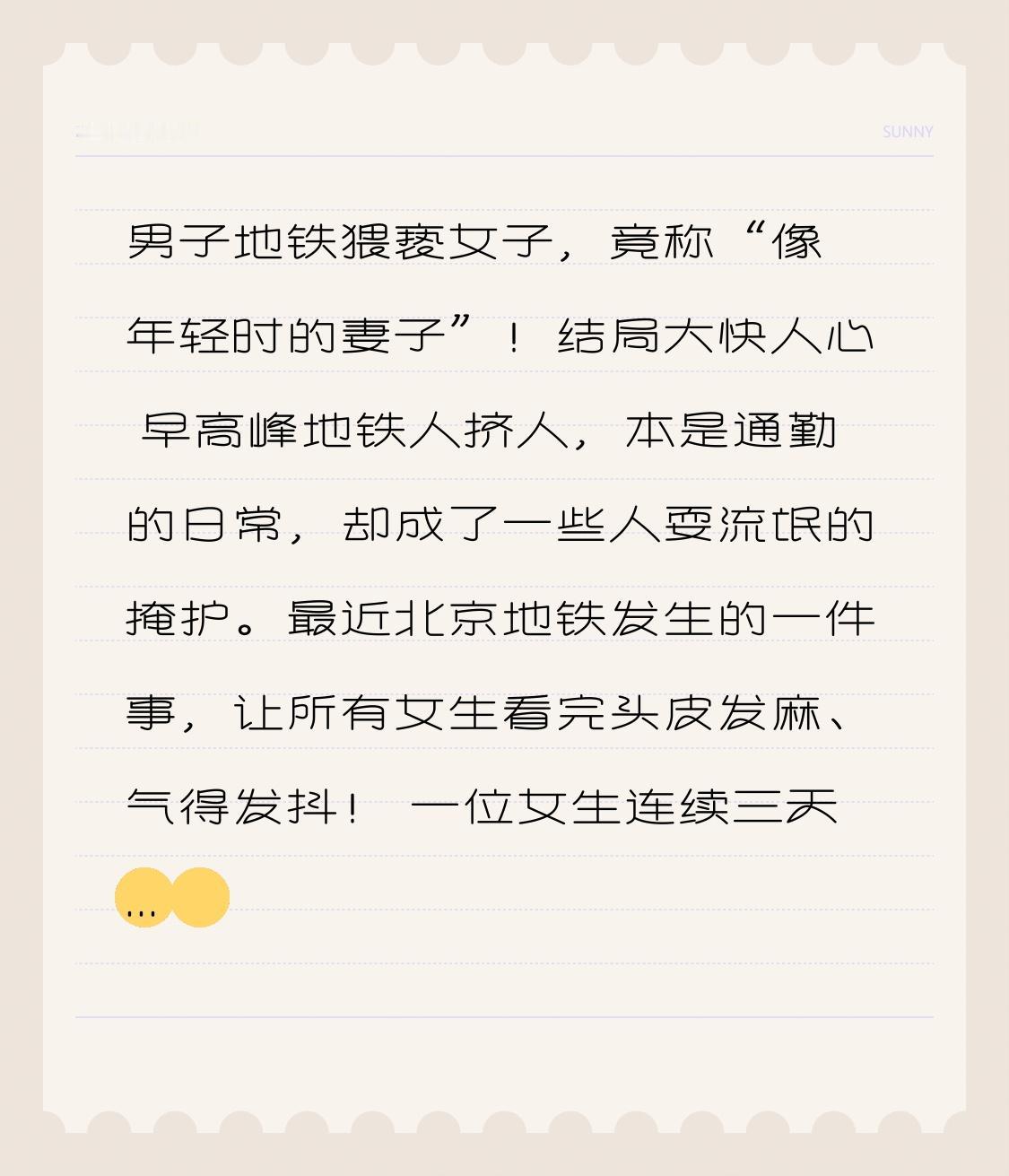 男子地铁猥亵女子,竟称“像年轻时的妻子”!结局大快人心 早高峰地铁人挤人,本是通勤的日常,却成了一些人耍流氓的掩护。最近北京地铁发生的一件事,让所有女生看完头皮发麻、气得发抖! 一位女生连续三天在同一车厢被陌生男子贴身骚扰,摸腰、摸臀、闻头发,动作猥琐至极。女生一开始以为是拥挤不小心,可对方变本加厉,明显是故意为之。她吓得不敢出声,每天通勤都活在恐惧里,甚至不敢再坐地铁,差点要换工作、换房子。 直到她鼓起勇气报警,监控还原了一切:男子早就摸清了女生的通勤时间和车厢,专门蹲守等待,就是为了实施猥亵。 更让人愤怒的是,被抓后他毫无悔意,还扯出一个荒唐借口:“她戴头花、气质清纯,像我年轻时的妻子。” 一句话把全网激怒:想念妻子你回家看,凭什么在地铁上祸害陌生女生?想念是你犯罪的理由吗?这不是深情,是变态,是赤裸裸的耍流氓! 转折点来了!法律不会放过任何一个坏人,结局极度舒适。 警方固定证据,检察院以强制猥亵罪提起公诉,法院最终判决:王某有期徒刑8个月! 一句“像妻子”救不了他,拥挤的车厢也不是保护伞,当众多次猥亵,性质恶劣,必须付出法律代价。 很多人说,地铁咸猪手只是小事,忍忍就过去了。可这件事告诉我们:性骚扰从来不是小事,它毁掉的是女生的安全感,践踏的是法律底线。任何借口,都不能成为侵犯他人的理由;任何伪装,都遮不住违法的事实。 女生们要记住:遇到骚扰不要忍,大声呵斥、立刻报警、保留证据,你越勇敢,坏人越不敢嚣张。 也提醒所有人:尊重是做人的底线,管好自己的手和心,别把龌龊当深情,别把违法当小事。 法律撑腰,正义不缺席。愿每一位女生出行都能安心,愿所有流氓都被严惩,愿公共空间里,再也没有恐惧与伤害。 你遇到过类似的骚扰吗?评论区说说,让更多女生学会保护自己!