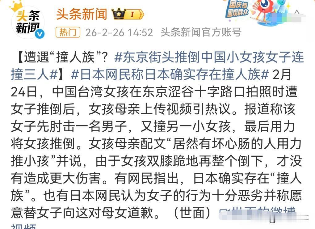 这真的是太恶劣了,竟无端端的撞一个小女孩,这简直心理变态吧。 2月24日,一名台湾女孩在东京一十字路口拍照,被一个女子撞击推倒。 这撞人的女子戴着个口罩,希望警方给点力抓到这个女人。不过从以往的案件来看,特别是针对中国人的袭击,日本警方破案率低的可怜,估计是指望不上日本警方了。 日本网民称日本确实存在撞人族。 撞人族,简直是令人发指,他们会仇恨外国人。