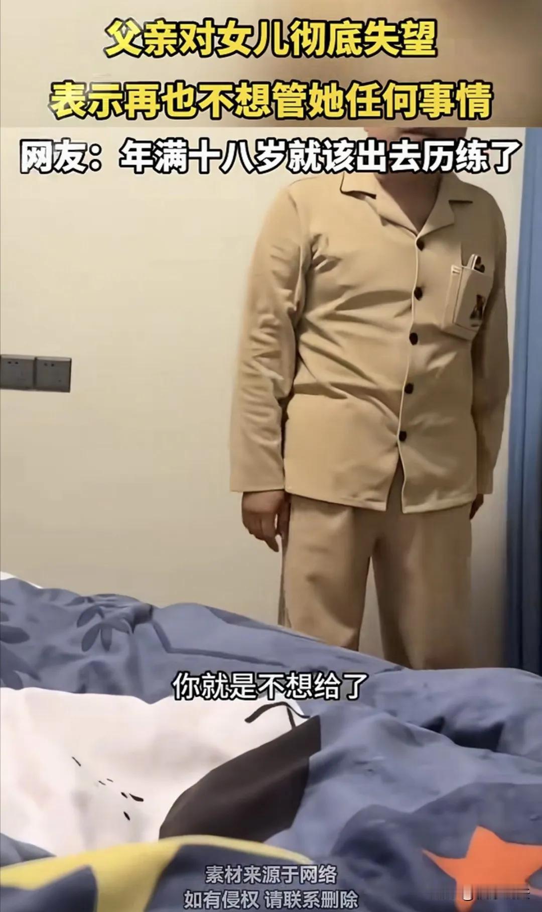 这就是富养女儿的结果。 中年男人站在女儿的床边,说“我今后不会再给你一分钱”。女儿躺在床上录父亲“你们中国大男子汉,你就是不想给了。牛~666。”父亲说“电脑、平板不是我买的?”转身气呼呼地离开。 对这位父亲同情不起来,女儿这样跟他有直接关系。从小就没有立规矩,子女顶多跟妈妈顶几句嘴,像这个家庭的女儿和爸爸这种态度并不多见,对于普通家庭来说,女儿不能娇养,儿子不能惯养。 老一辈打孩子纠恶习,不是不爱护孩子,是对孩子最大的负责。现在满世界宣扬的快乐成长,物质富养,其实是在毒害下一代。