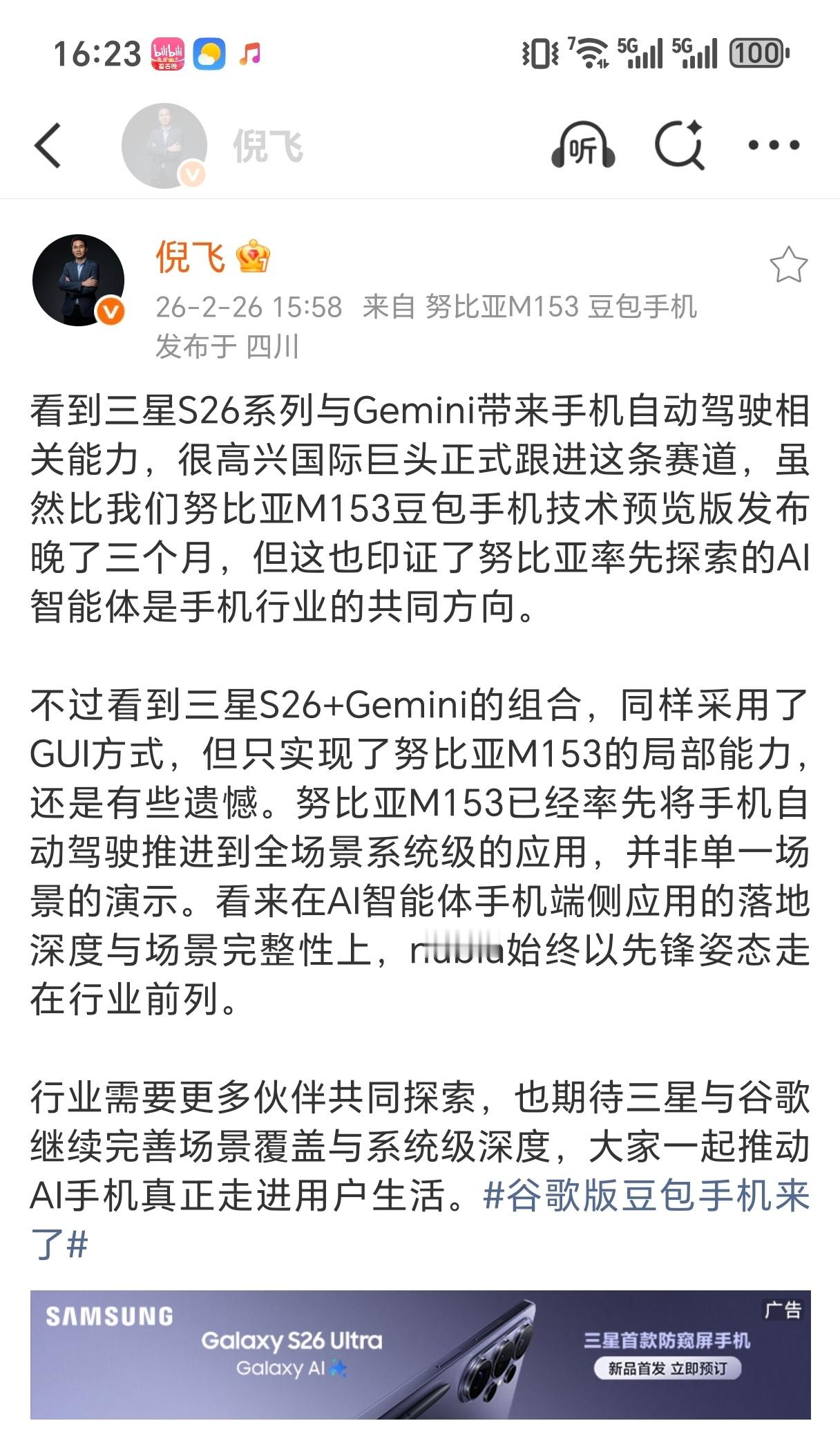 努比亚总裁倪飞回应谷歌版豆包手机刚刚发布的三星S26系列,与Gemini带来了手机自动驾驶相关能力,也采用了GUI方式,跟进了努比亚手机的技术路线,不过效果只实现了努比亚M153的局部能力。这么来看,努比亚M153豆包手机还是过于先进了,难怪一上市就备受关注好评。 高管称S26只实现豆包手机局部能力