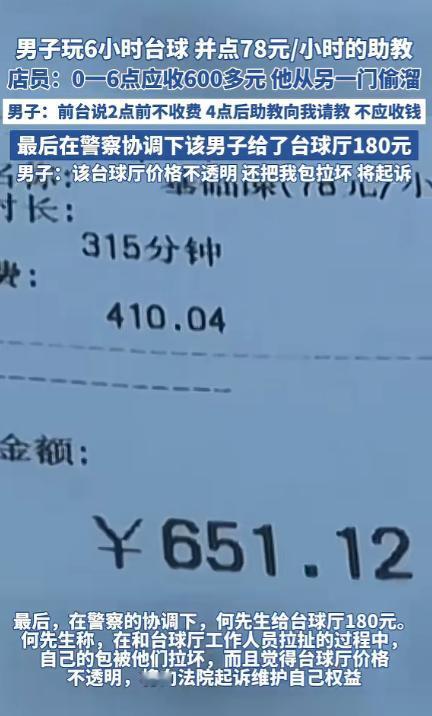 2025年重庆,男子去打台球,为了增加点乐趣,点了一位美女助教,结果,玩的太兴奋,直接和女助教玩了一个通宵,总共消费651元,天亮后,男子却想不结账就走,被台球厅工作人员拦住,男子竟然先一步报了警。 重庆的夜晚从来都不缺热闹,各类休闲娱乐场所更是熬到凌晨依旧灯火通明,2025年重庆城区一家台球俱乐部,就发生了一件让人哭笑不得的奇葩纠纷,整件事的走向堪称离谱,不少知晓的市民都觉得又好气又好笑。 一名本地男子深夜闲来无事,想找个地方打发时间放松身心,便独自走进了家附近的一家台球厅。 原本他只是打算自己独自打几杆台球解闷,可独自玩了没多久,就觉得一个人打球太过枯燥乏味,没什么参与感和乐趣。 想起店内有专业的美女助教陪打服务,收费标准为78元每小时,想着有专人陪同切磋球技会更有意思,男子便主动提出,要预约一位美女助教陪同自己打球。 助教到位后,两人很快就投入到台球娱乐中,从一开始的简单试打,到后来的比拼切磋,男子的手感越来越热,情绪也越来越亢奋,完全沉浸在打球的快乐里。 助教全程配合默契,不仅会适时指导打球姿势和技巧,偶尔也会和男子比拼几局,一来二去,两人越玩越起劲,彻底把时间抛在了脑后。 台球厅里的客人渐渐少了,从三四桌缩到只剩他们这一桌,绿色的台尼在灯光下泛着温润的光,白球撞向彩球的脆响,一声接着一声,像敲在深夜的鼓点上。 助教也跟着他的节奏,一会儿递上凉好的矿泉水,一会儿弯腰摆球,偶尔也上手打两杆,两人配合得越来越默契。 重庆这边的台球厅,凌晨时段的助教服务本就常见,不少熬夜加班族、夜猫子都爱来这找个伴儿。 助教说她每天都要值到凌晨,遇到过不少玩嗨了的客人,只是像男子这样打一整晚的,还是少见。 男子这时候早沉浸在台球里,连手机都没看,直到天边泛起鱼肚白,他才猛地抬头,窗外的天已经亮了,手里的球杆还惯性挥了一下,白球滚了半天才慢慢停住。 就在男子愣神的功夫,前台小姑娘拿着一张打印好的账单走了过来,递到他面前:“哥,账单算好了,台费加助教费还有两瓶水,一共651元。” 男子凑过去看,账单上的数字清清楚楚:助教服务6小时468元,台费160元,饮品23元,加起来正好651元。 他的脸瞬间垮了,眉头皱成疙瘩,一把推开账单,声音陡然拔高:“不可能!你们这是乱收费!我记得你们前台说过,2点前不收费的!” 他还提出另一个说法,称凌晨4点之后,陪打的助教并非在为自己提供服务,反而主动向他请教台球技巧。 这部分时长根本不属于助教服务,不应该计入收费时长里,坚持认为台球厅价格不透明,存在不合理收费的情况。 面对男子的指责,台球厅工作人员十分无奈,耐心向其解释清楚收费规则:前台所说的2点前不收费,仅针对台球台费。 助教陪打属于单独的增值服务,78元每小时的收费标准,明明白白张贴在店内前台和球台旁的显眼位置,0点到6点均按实际服务时长计费,不存在任何隐藏消费或虚假标价。 同时工作人员表示,助教是店内在职员工,工作期间与顾客的所有互动都属于服务范畴,男子全程没有提出过暂停或终止服务,理应按照实际陪伴时长结算费用。 男子见理论不过工作人员,便动了逃单的心思,趁现场工作人员不备,悄悄绕到台球厅的侧门,想要偷偷溜走不买单。 可他刚走到侧门门口,就被负责值守的工作人员及时发现并拦住,逃单的想法彻底落空。 令人意想不到的是,被拦下后男子非但没有愧疚之意,反而抢先拿出手机拨打110报警电话,对着民警声称自己遭遇台球厅强制消费、恶意乱收费,颠倒黑白把自己塑造成被坑的受害者。 民警接到报警后迅速赶到现场,分别向男子、台球厅工作人员以及陪打助教核实完整经过,同时仔细查看了店内明码标价的价目表、消费计时记录,也确认了助教当晚的工作状态。 助教如实向民警说明,凌晨4点后确实和男子交流过台球技巧,但自己始终处于工作服务状态。 男子也从未提出过停止服务,不存在免费请教的情况。民警还查看了男子的背包,发现包体确实有轻微破损,男子称是被工作人员阻拦时拉扯损坏。 随后民警现场进行公平调解,向男子讲明消费付费的基本准则,经过协商,男子最终仅向台球厅支付了180元费用,这笔钱只覆盖了部分台费和饮品费用,原本468元的助教服务费基本全部减免。 一场原本开开心心的通宵台球局,最后演变成逃单、报警、协商减免的闹剧,实在让人唏嘘。 对于这件事,您有什么想说的吗?欢迎评论区留言讨论。 信源:海报新闻2025-06-16——《男子玩台球从0点玩到6点,并点了一名78元/小时的助教。店员:最后他没有结账就从另一个门跑……》
