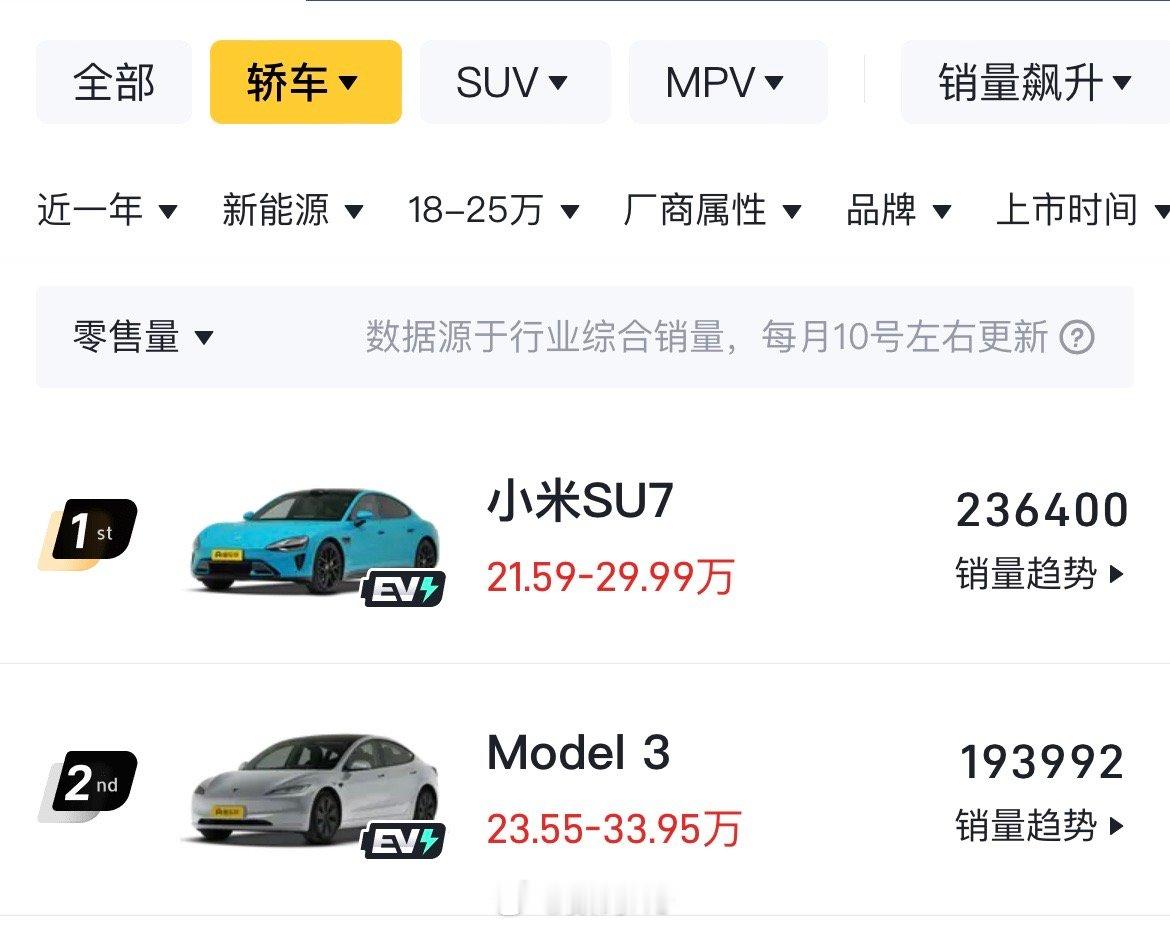 人人都对标特斯拉,但是真正能在销量上超越特斯拉model 3,也就只有小米su7做到了。对比下去年小米su7销量为 236,400 辆, 特斯拉Model 3销量为 193,992。接下来,就看新一代小米su7的表现了,想必不会差