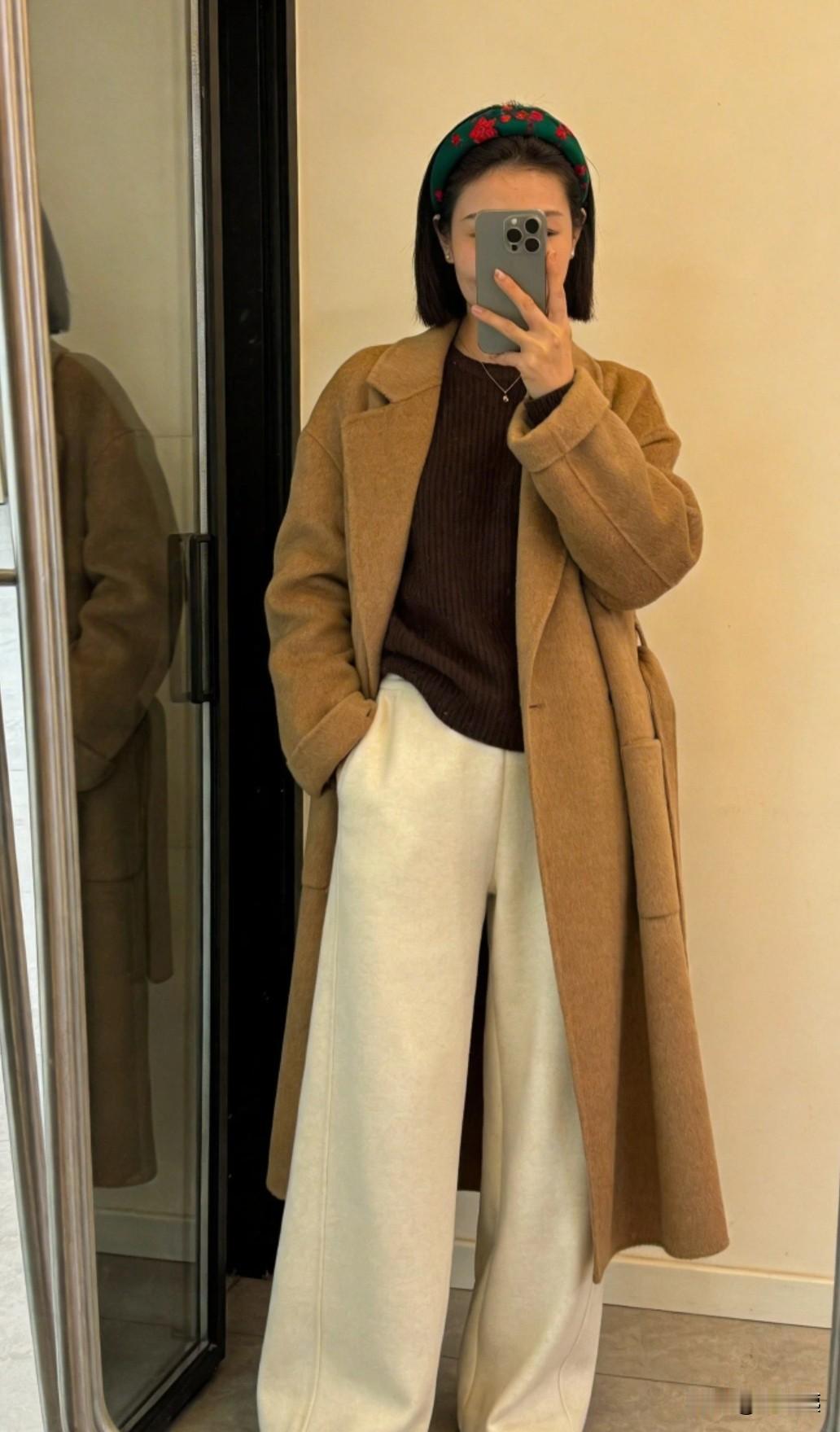 53岁的我,穿了一件驼色大衣,内搭咖色羊绒衫,一条米白色羊绒阔腿裤,朋友说我装嫩,和30岁的女人有的一拼[黑线] 真没觉得自己装嫩啊,穿衣风格一直是这种的呀! 再说,30岁的女人可不是这种打扮,她们青春多了![大笑] 朋友说我装嫩,回家拍了一张照片,仔细想想,是不是今天戴了一个发箍啊?[笑哭] 戴发箍,也不是为了装嫩,而是年前染发买错了颜色,884天然棕色买成了882棕黑色,染出来的发色偏黑,所以戴个发箍,分散一下自己的注意,要不然怎么看自己的头发颜色怎么不顺眼。[笑哭] 说我装嫩就装嫩吧,穿衣风格,这是改变不了的,自己喜欢就好![奸笑]