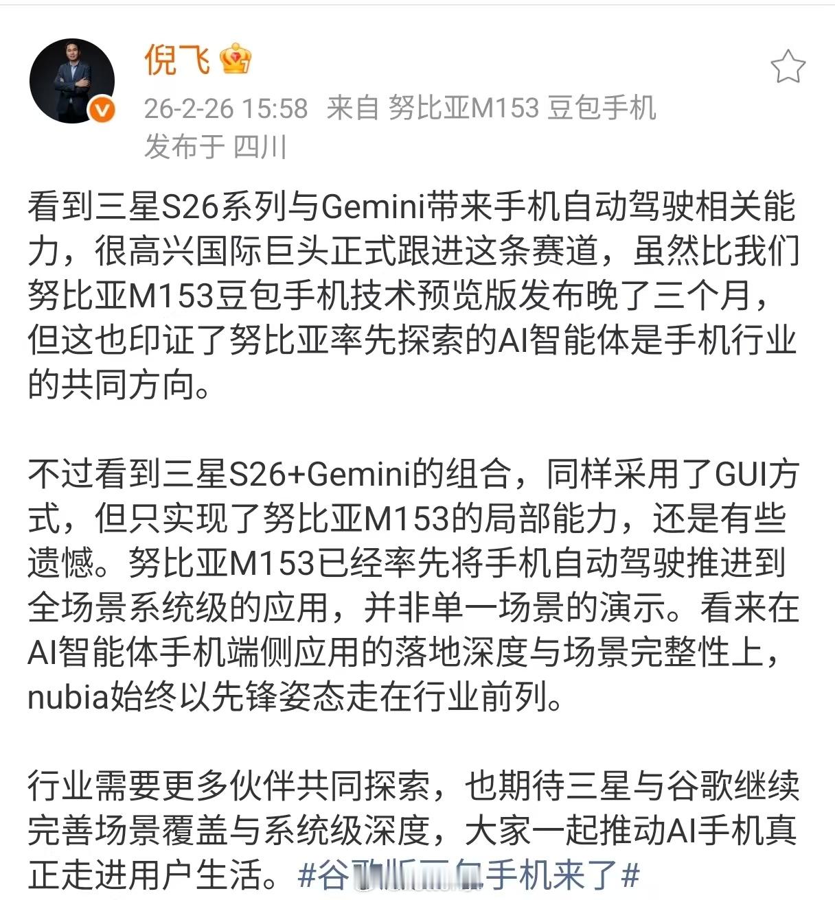 高管称S26只实现豆包手机局部能力努比亚总裁倪飞回应谷歌版豆包手机三星 S26 联手 Gemini 落地手机 AI 智能体,这下消费者 AI 终端彻底热闹了。巨头扎堆入场,恰恰说明努比亚早走对了方向——AI 智能体就是行业共识与未来。对比很明显,三星目前还是部分能力落地,而努比亚 M153 豆包手机,三个月前就把手机自动驾驶做到全场景、系统级,不是演示,是真能用。端侧深度、场景完整度、系统整合力,努比亚确实走在前面。行业需要更多玩家一起卷,期待三星、谷歌继续加码,和努比亚一起把 AI 手机从概念变成日常,让真正的智能体走进每个人手里。倪飞称豆包手机领先三星谷歌组合