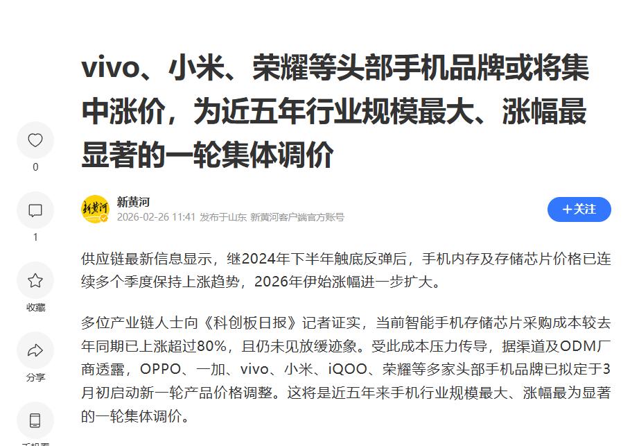 存储的火终于烧到了手机行业,2026年手机行业将全面涨价,便宜手机没了? 据供应链人士从各大手机品牌内部获悉,3月起,手机涨价将进入加速阶段,新品涨价可高达1000元。先说为啥涨价,核心原因就是存储芯片价格暴涨,近三月手机存储芯片现货价涨超 300%,美光、西部数据等存储大厂股价也一路走高。 未来想买大存储手机必须要花更多钱了,内存越大涨价越厉害,但很多人不知道,选对渠道,其实也能避开这些涨价。在这里,给大家3个建议: 一是可以选2025年的旗舰机买,不一定一定要买2026年的手机,毕竟现在手机性能严重过剩,加上新机的溢价,选2025年甚至2024年的全新未拆封机器,是不错的选择。 二是选择折扣平台买,这个属于信息差。去年在唯品会买过一个三星A56手机,当时各个平台都比了下,8+256的新机基本在2200往上,12+256则是2400往上,唯独唯品会叠加国补后干到了1900多,当时就买了。虽然现在这手机价格比1900更低了,但也说明了信息差是存在的,折扣平台买手机也是有机会省钱的。 三是买二手,很多人对二手有误解,认为使用了很久的手机,实际上现在不少年轻人,刚买几天半个月就觉得没有想象中好就亏几百上千元卖了。例如之前iPhone17系列没出来多久,就有不少人买了又卖,这种机子还是可以买。不过二手水很深,不懂验机的人还是不要轻易尝试。
