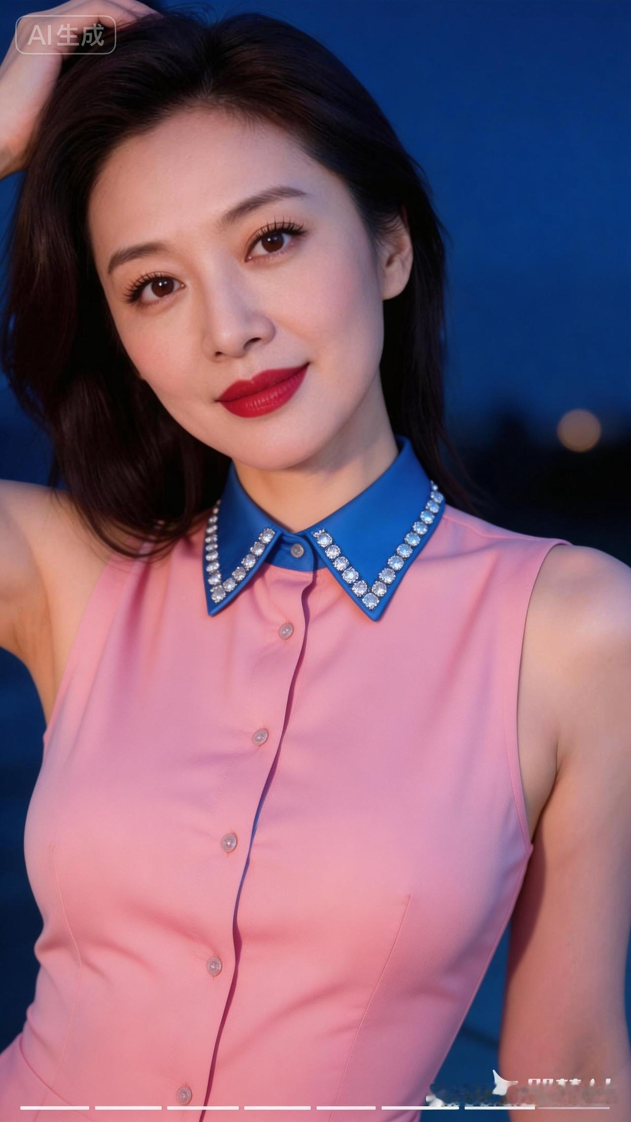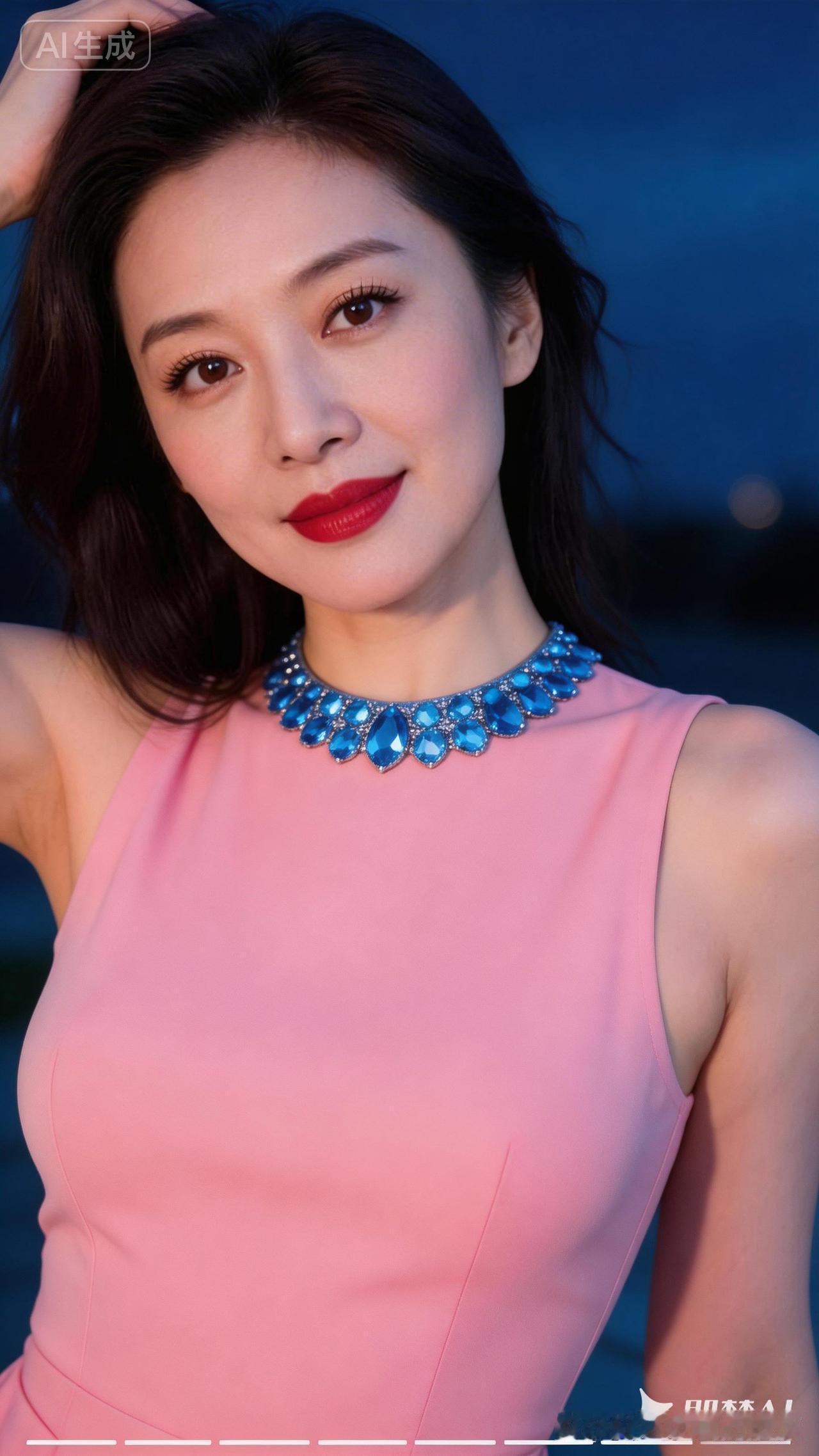 优雅红唇,粉色礼服,蓝色项链,夜晚的迷人魅力