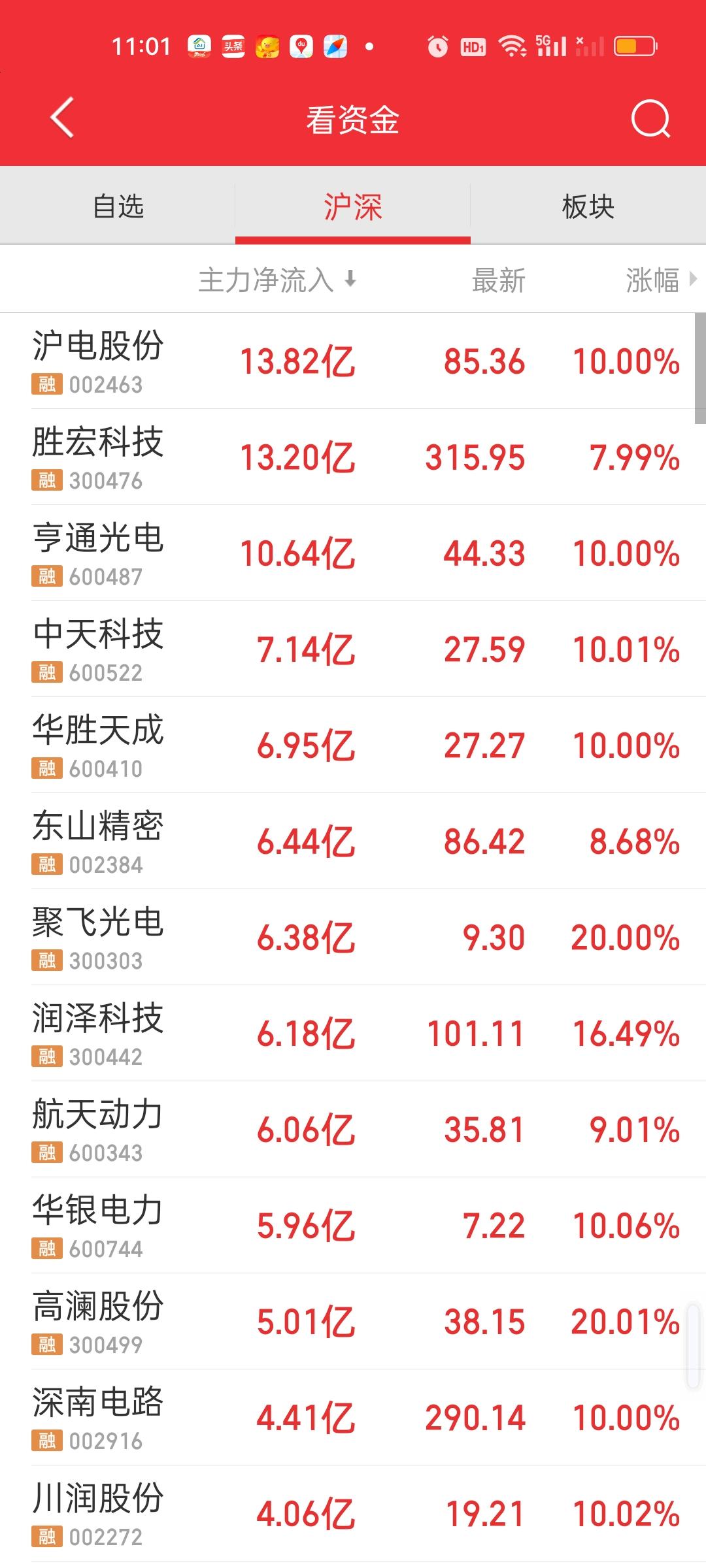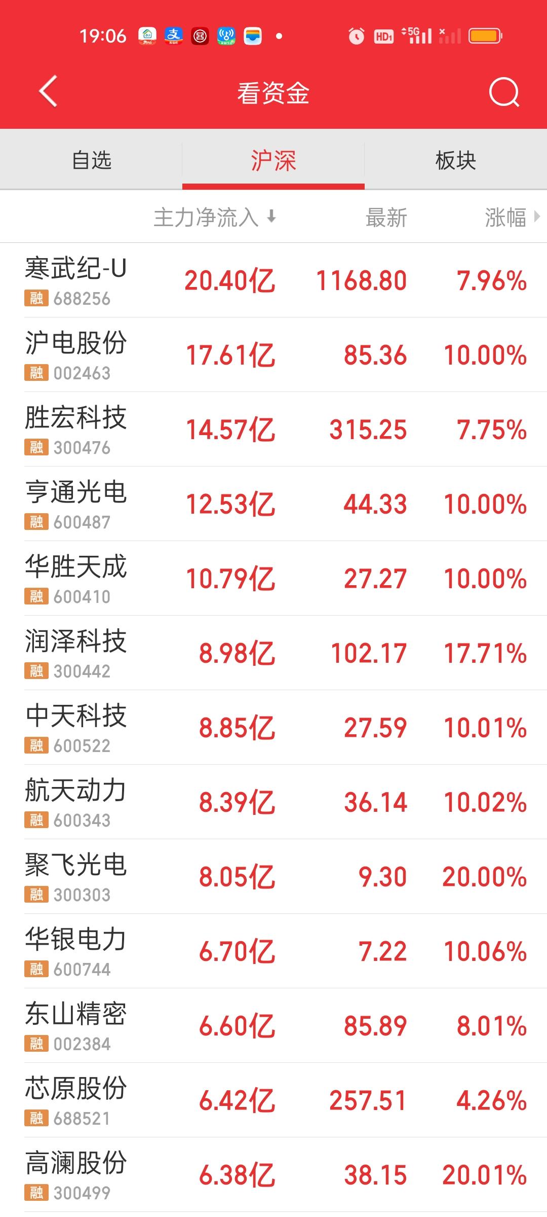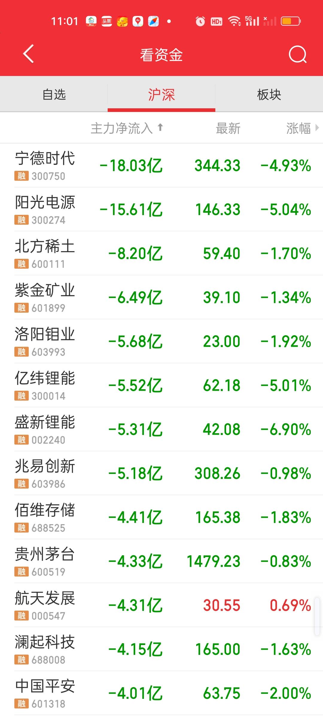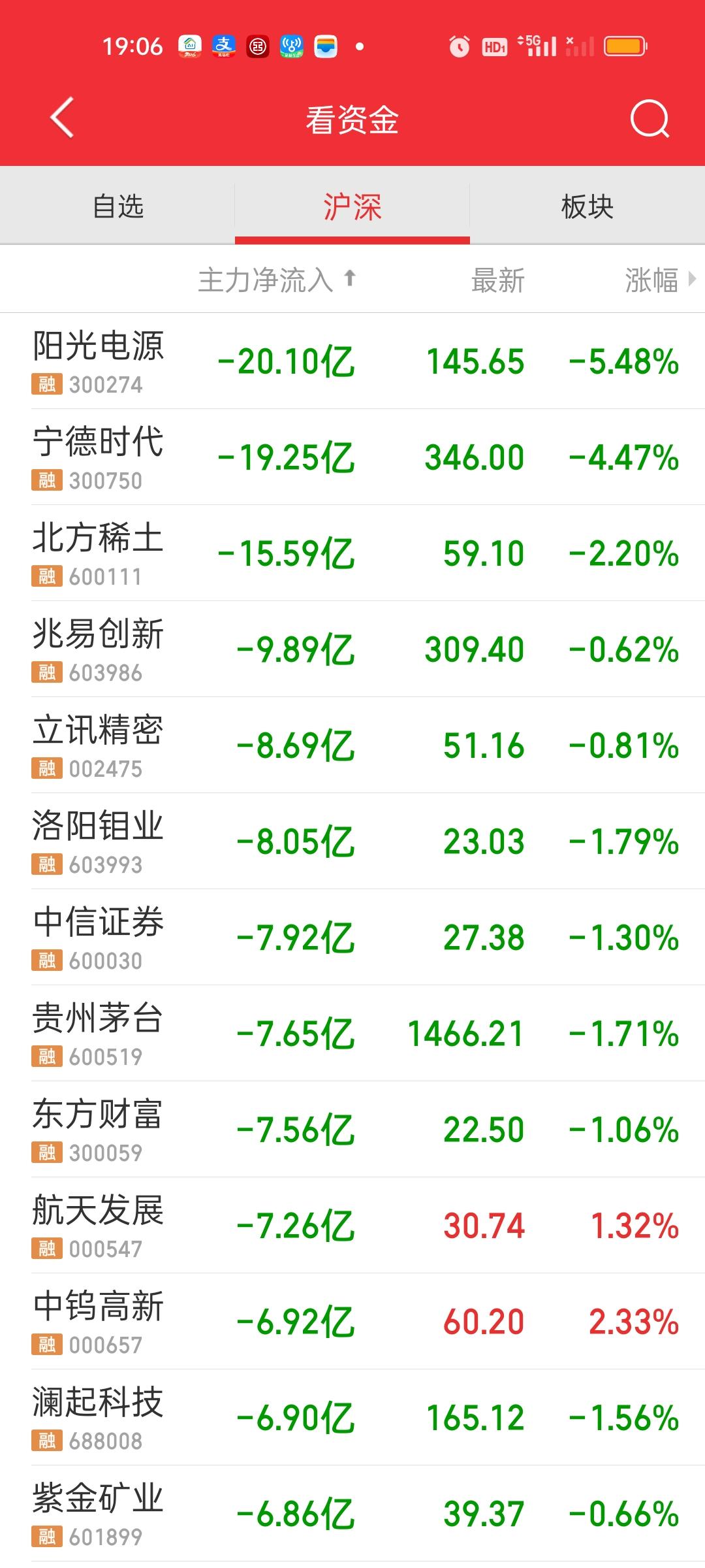 全天收盘了,下午大盘资金还在加速流出,昨天全天只流出了295.71亿,而今天全天净流出640.50亿,中午收盘指数跌了12.54点,全天收盘跌了0.60点,下午指数在拉升可资金在加速逃离。这是完全相反的方向。 主力资金净流入方面,上午只有沪电,胜宏和亨通主力资金净流入在10亿元以上,下午增加了寒武纪和华胜天成,其中寒武纪上午并没有资金净流入,全天净流入超过20亿,股价也是大涨7.96%。 主力资金净流出方面,净流出资金超过10亿的个股新增了北方稀土。宁德时代和阳光电源净流出资金接近20亿元。