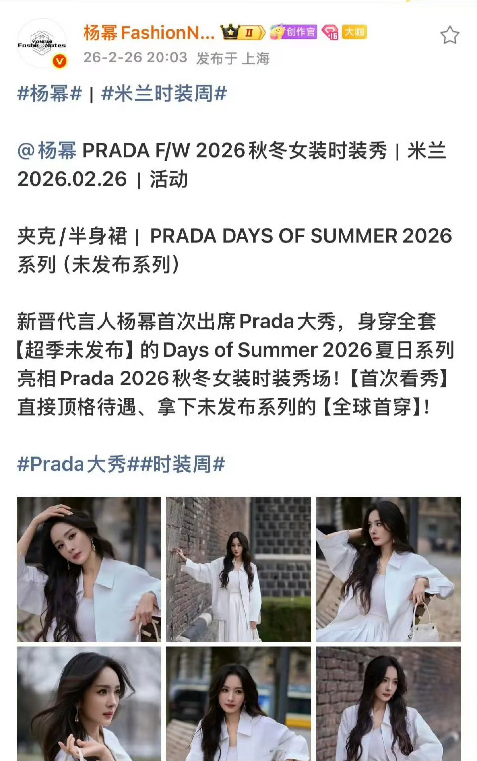 prada真的太宠爱代言人杨幂了,空降代言人,VOGUE开年刊,时尚芭莎开季刊,首次看秀 ,超季未发布, 全球首穿,这就是prada女王打待遇