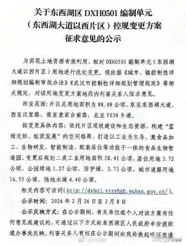 东西湖张辛路这里用地性质调整!2月26日,为实现土地资源有效利用,拟对东西湖区DXH0501编制单元(东西湖大道以西片区)控规变更方案征求意见的公示。四至范围:片区总用地面积为88.08公顷,东至东西湖大道、西至汉宜路、南至袁家台南路,北至Y030乡道。 依托片区现状建设和生态资源,构建“蓝绿交织、组团发展”的空间格局,打造以工业为主导,集食品加工、生物研发、智能制造、配套居住等功能于一体的食品生物智造园。变更后规划二类工业用地面积58.41公顷,居住用地3.72公顷,公园绿地1.27公顷,防护绿,3.73公顷,城市道路用地16.55公顷,陆地水域4.40公顷。