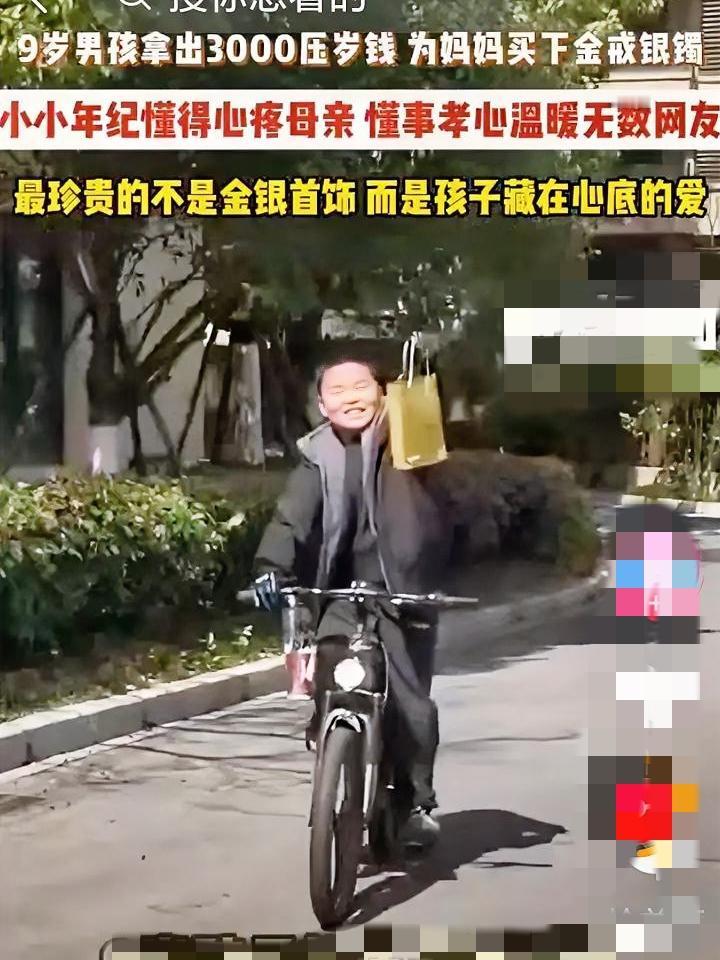 破防了!9岁男孩花光3000元压岁钱,只为实现妈妈一个心愿…… 近日,浙江嘉兴一位男孩瞒着妈妈花光自己全部3000元压岁钱,给妈妈买了金戒指、银手镯,还不忘带一杯妈妈最爱喝的奶茶。 2月26日,姚女士像往常一样在家,没想到儿子突然兴冲冲跑进门,手里攥着包装好的首饰盒和一杯奶茶,眼神里满是期待。没人知道,这个才9岁的小男孩,是偷偷独自出门,凭着记忆找到金店,一点点挑选妈妈可能喜欢的款式。 他没给自己留一分钱,把过年收到的所有压岁钱,全都花在了妈妈身上。挑选完首饰,还特意绕远路去奶茶店,买了妈妈爱喝的口味,生怕耽误一秒,着急地跑回家送礼物。 姚女士拆开首饰盒的瞬间直接愣住,还没等反应过来,就听见儿子认真地说:“给妈妈花钱,我一点也不心疼。”一句话,让姚女士瞬间红了眼眶,感动的说不出话来。 她试着戴上戒指,发现尺寸稍小,却笑得合不拢嘴,小心翼翼地珍藏起来,直言这是自己这辈子收到最珍贵的礼物,再多钱也换不来这份心意。 小小年纪就懂得感恩,把妈妈的喜好记在心里,用自己的方式爱着妈妈。为他点赞! 9岁男孩花3000元给妈妈买首饰 压岁钱的正确打开方式 双向奔赴的亲子爱 请问你家孩子收到压岁钱会做什么?有没有过让你感动的瞬间?评论区说说呗~