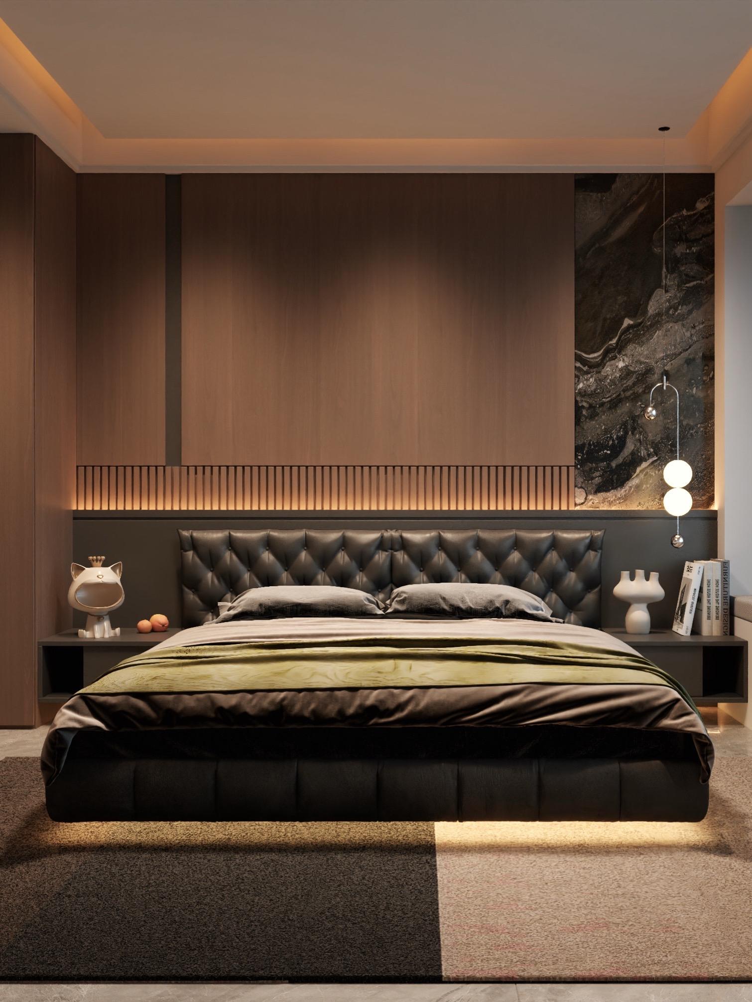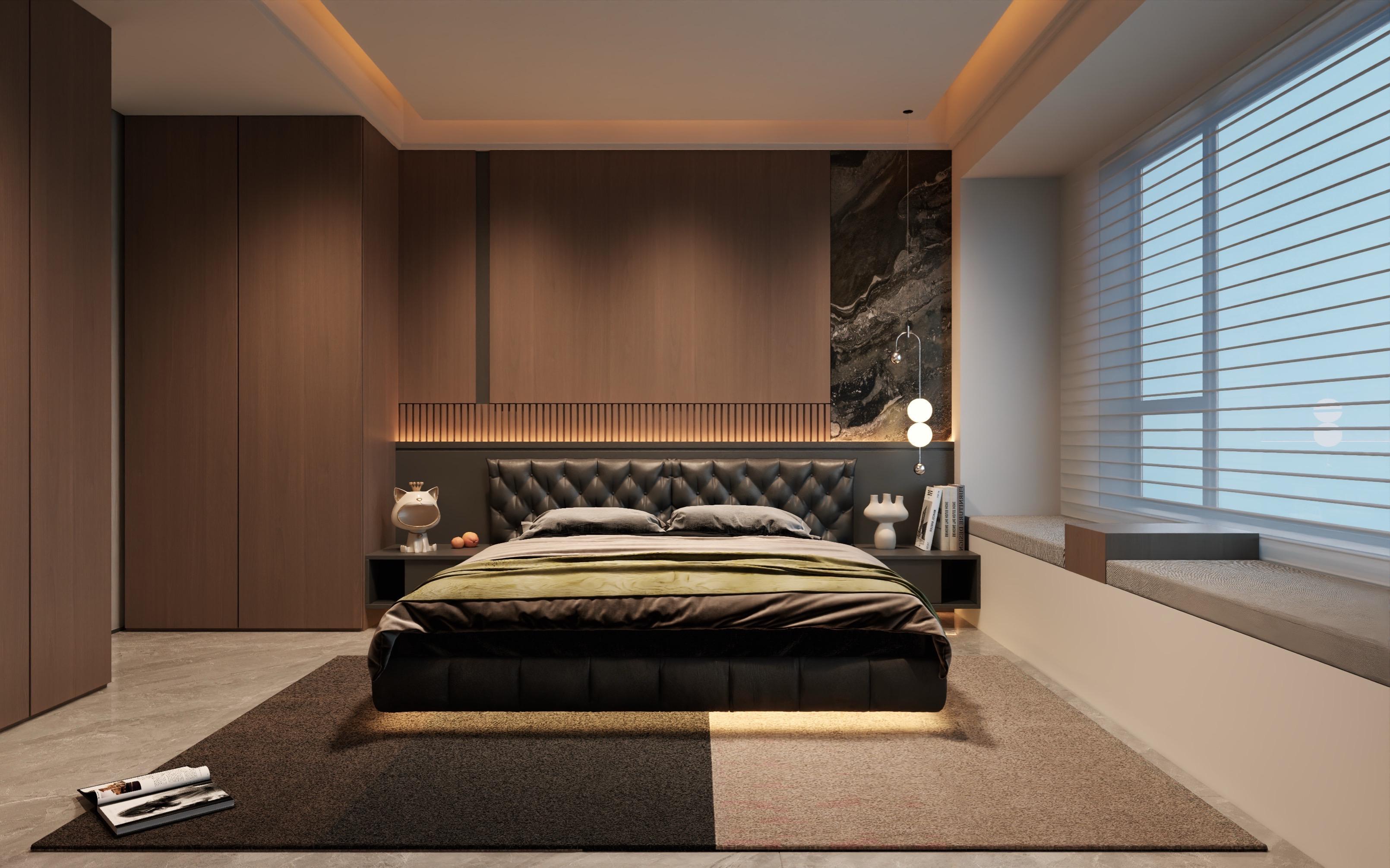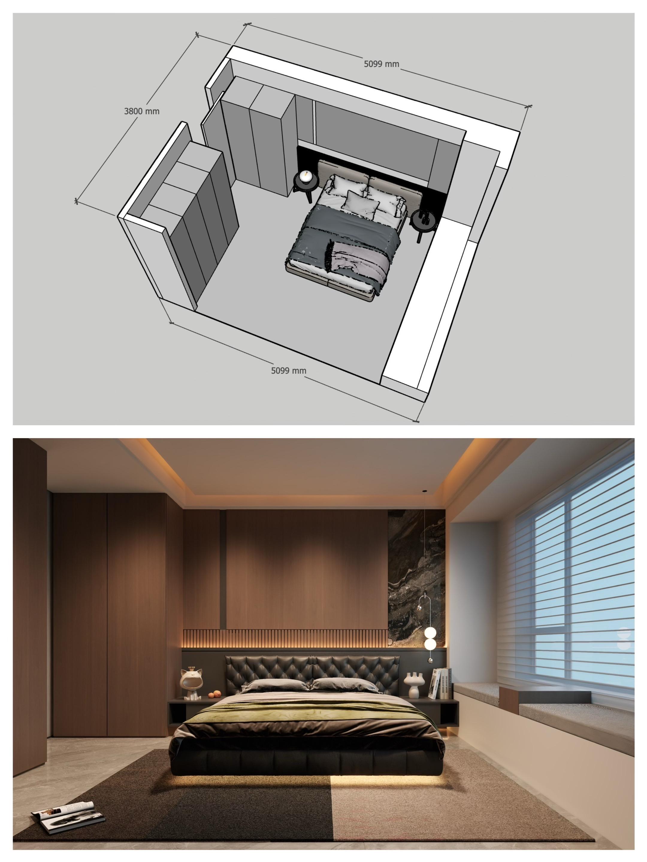 • 𝑳𝒀 𝑫𝑬𝑺𝑰𝑮𝑵 意式风设计分析 🏠空间布局与尺寸 .房间尺寸为 5099mm x3800mm,呈长方形,布局不紧凑合理(床卫生间门问题业主没要求) ·床居中放置,两侧对称设置床头柜与吊灯,背景墙采用整面墙板+局部岩板拼接,视觉上延伸空间感。 ·左侧为通顶衣柜,右侧为窗边飘窗台,兼具储物与休闲功能。 设计风格与材质 .主色调:深棕木色+黑色 营造沉稳高级感。 .床具:黑色皮质软包床头+悬浮床体,搭配精致床品,点缀亮色。 .背景墙:左侧木饰面+右侧深色岩板,形成材质对比,提升层次。