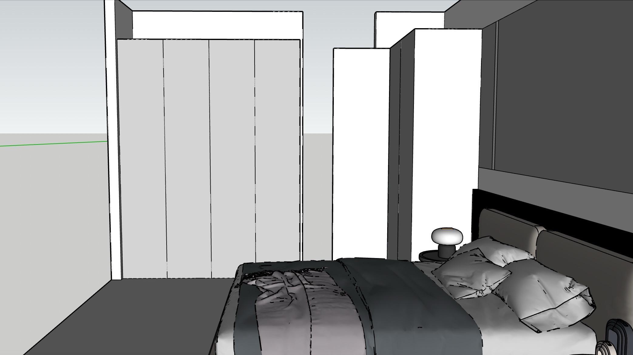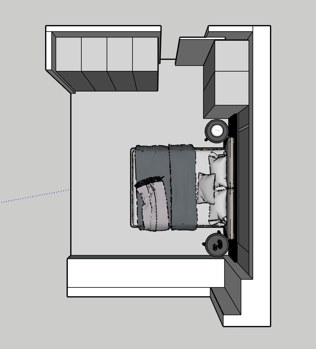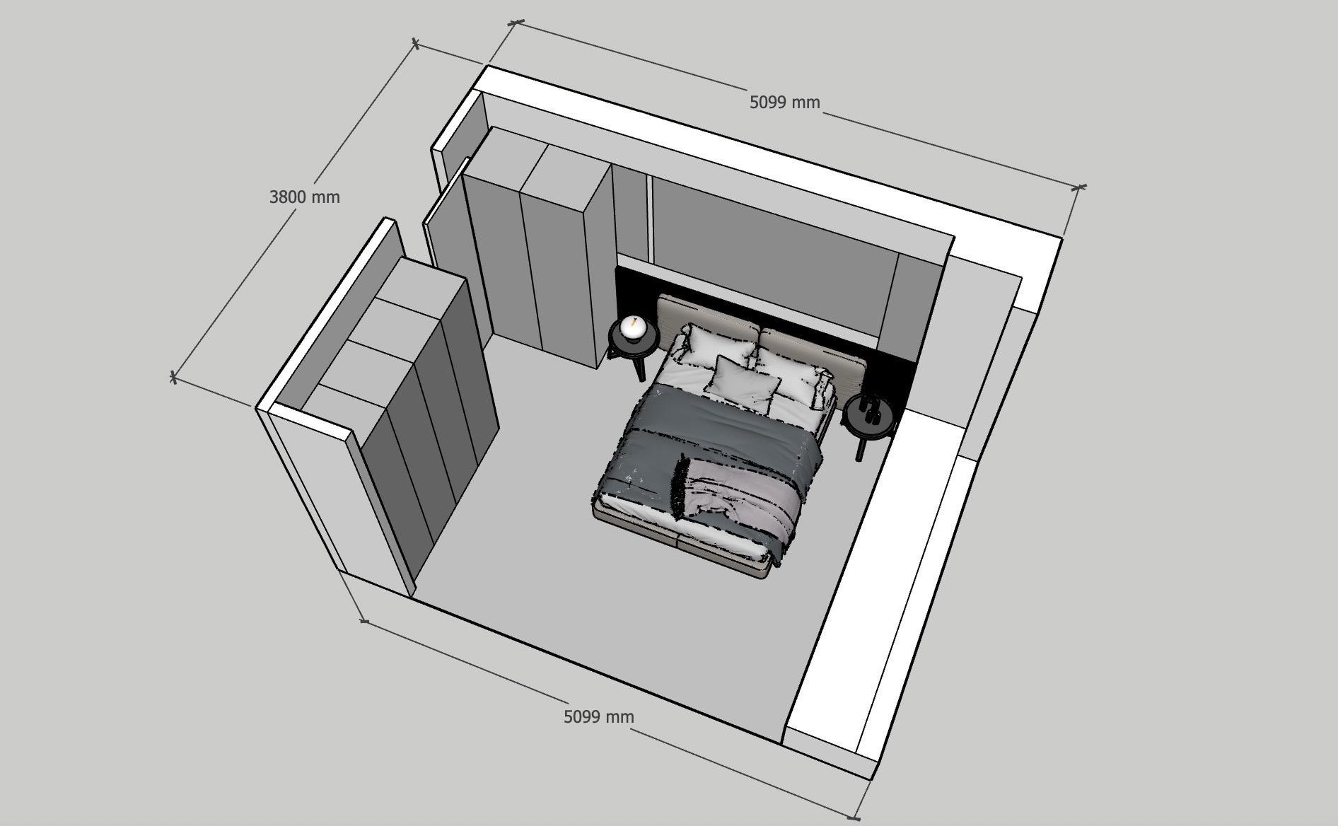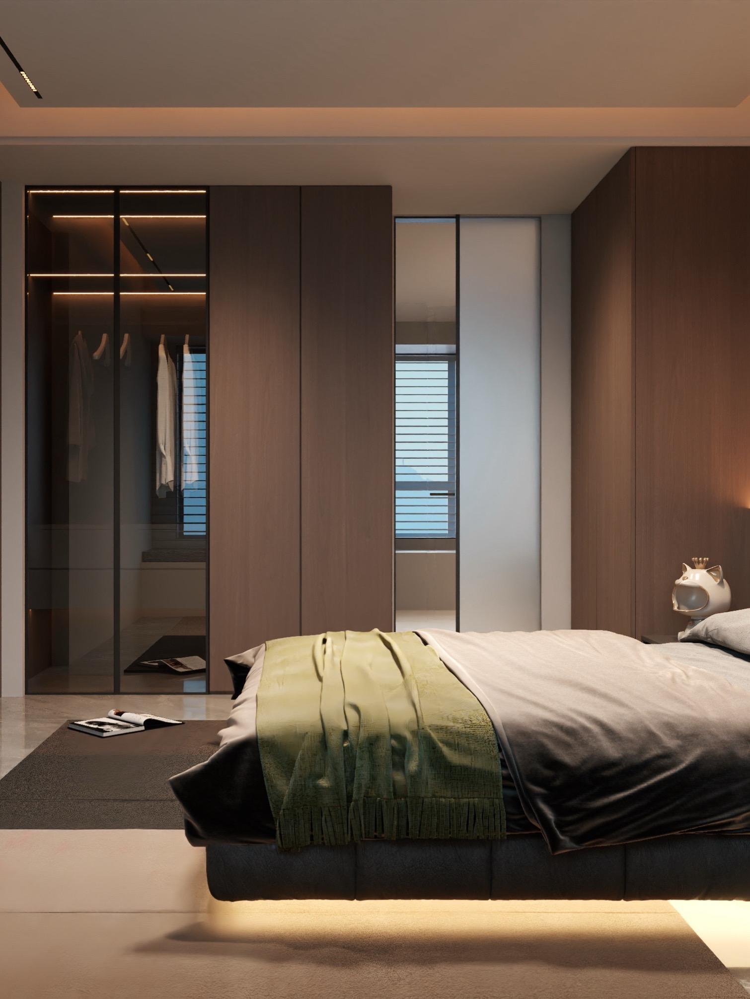 • 𝑳𝒀 𝑫𝑬𝑺𝑰𝑮𝑵 意式风设计分析 🏠空间布局与尺寸 .房间尺寸为 5099mm x3800mm,呈长方形,布局不紧凑合理(床卫生间门问题业主没要求) ·床居中放置,两侧对称设置床头柜与吊灯,背景墙采用整面墙板+局部岩板拼接,视觉上延伸空间感。 ·左侧为通顶衣柜,右侧为窗边飘窗台,兼具储物与休闲功能。 设计风格与材质 .主色调:深棕木色+黑色 营造沉稳高级感。 .床具:黑色皮质软包床头+悬浮床体,搭配精致床品,点缀亮色。 .背景墙:左侧木饰面+右侧深色岩板,形成材质对比,提升层次。