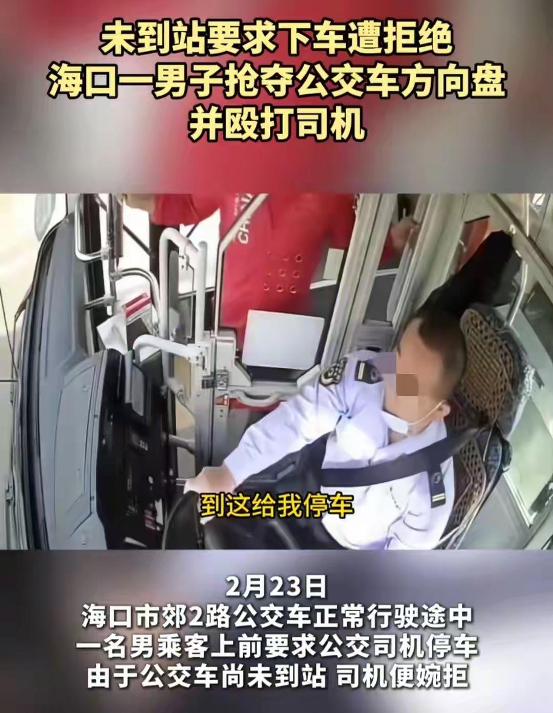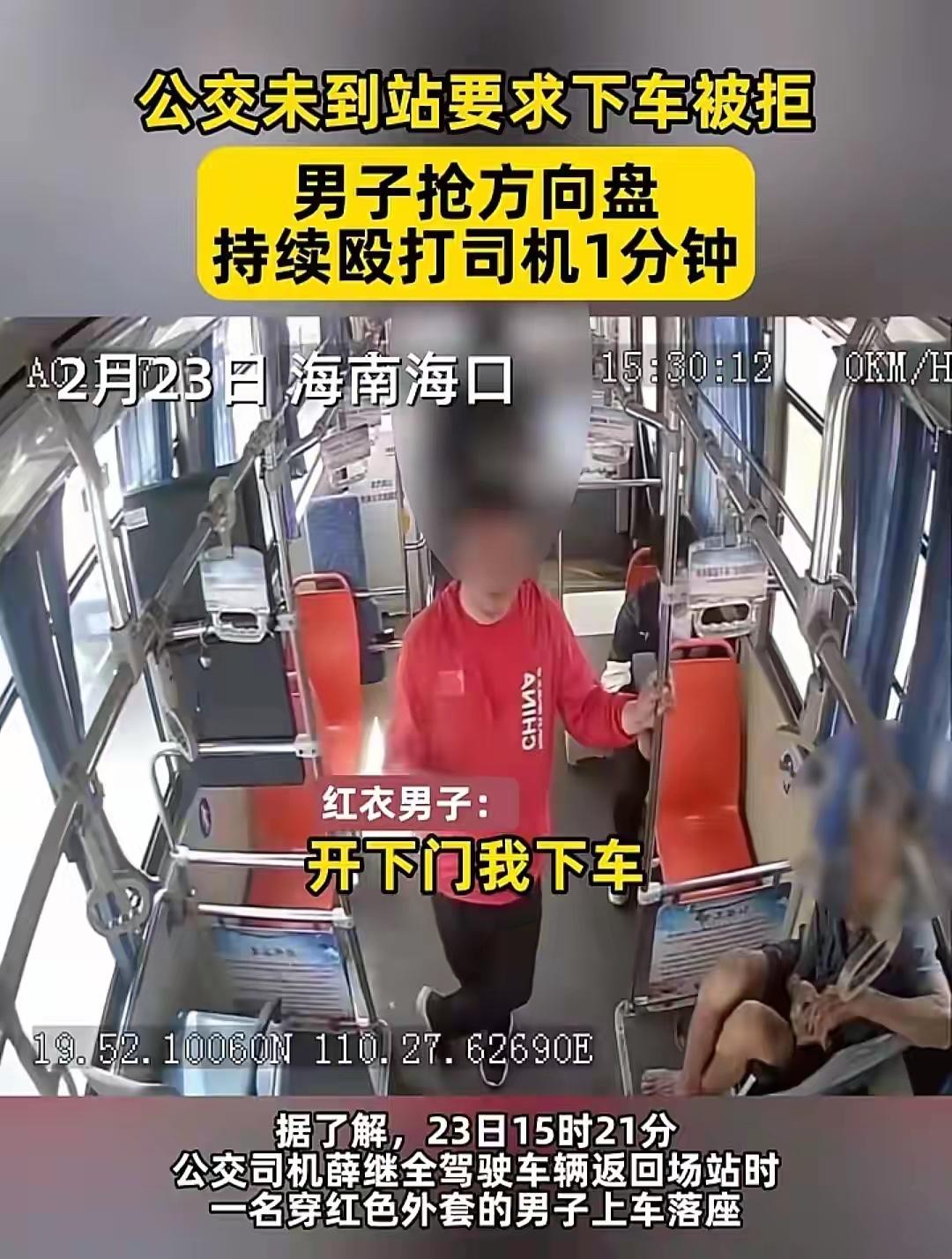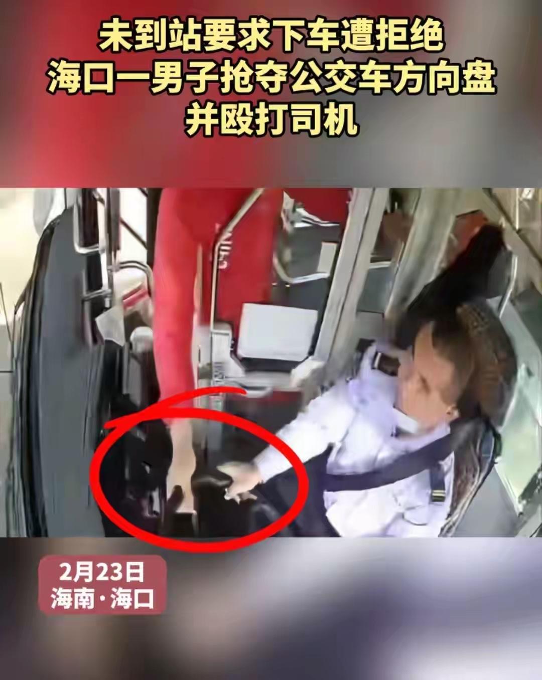 太嚣张了,海口公交车上殴打司机抢夺方向盘的红衣男子。2月23日下午,他搭乘的是海口2路公交,玩手机错过站了,一抬头就要求司机停车,当班的薛师傅知道这是违规的,公交车不能在非站点停车。可是红衣男子觉得司机没给面子,暴脾气一下子就上来了,上去威胁司机停车。司机没有按照他的要求,红衣男子敲击驾驶室门,没想到红衣男子竟然去抢夺方向盘,薛师傅紧紧抱着方向盘不松手。男子见无法得逞,恼羞成怒,变成暴力攻击。司机没办法,才开了车门,红衣男子趁机溜走。不过公交公司报警后,红衣男子很快被抓。