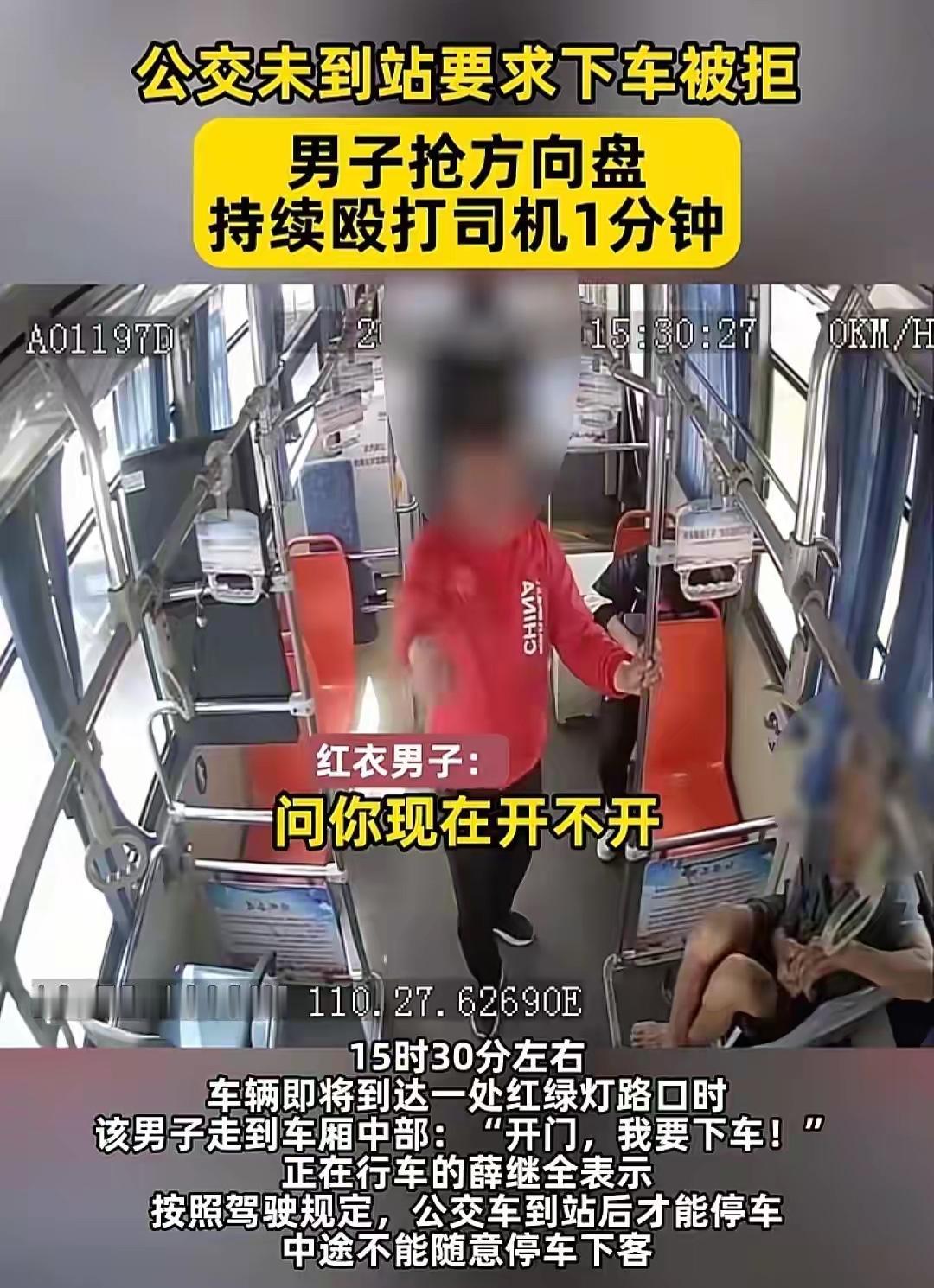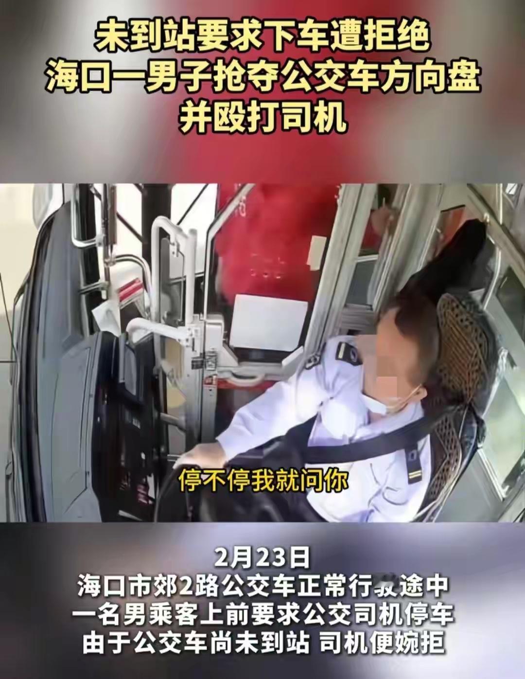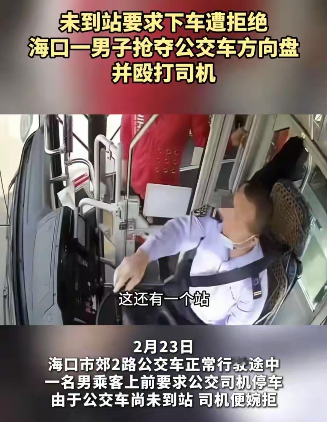 太嚣张了,海口公交车上殴打司机抢夺方向盘的红衣男子。2月23日下午,他搭乘的是海口2路公交,玩手机错过站了,一抬头就要求司机停车,当班的薛师傅知道这是违规的,公交车不能在非站点停车。可是红衣男子觉得司机没给面子,暴脾气一下子就上来了,上去威胁司机停车。司机没有按照他的要求,红衣男子敲击驾驶室门,没想到红衣男子竟然去抢夺方向盘,薛师傅紧紧抱着方向盘不松手。男子见无法得逞,恼羞成怒,变成暴力攻击。司机没办法,才开了车门,红衣男子趁机溜走。不过公交公司报警后,红衣男子很快被抓。