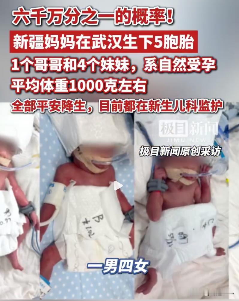 比中彩票还幸运!2月26日凌晨,武汉传来喜讯:一位从新疆跨越数千公里求医的24岁妈妈,成功分娩了五胞胎!网友:医学奇迹,祝福他们! 据了解这位妈妈今年才24岁,正值大好年华,却怀上了全球都罕见的自然受孕五胞胎。因为多胞胎风险实在太大,她特意从新疆远赴武汉大学中南医院。2月25日晚上11点半的时候,产妇突然胎膜早破,救护车呼啸着冲进医院。 医院的反应速度简直让人惊叹,15分钟内,产科、新生儿科、麻醉科等所有顶尖团队全部到位。到了凌晨3时许,五个小生命依次降临。整个手术过程就像一场没有硝烟的战争,医生们一边接生,一边还得盯着产妇的出血情况,又是促子宫收缩药,又是自体血回输,总算把这位勇敢的妈妈从鬼门关拉了回来。 这五个宝宝一出生,护士们心都化了,但也紧张得不行,咱们来看看五个宝宝的的数据: 老大(男宝): 990克,老二(女宝): 1020克,老三(女宝): 970克,老四(女宝): 1030克,老五(女宝): 870克,五个孩子里四女一男,最重的才两斤出头,最轻的连一斤八两都不到。 网友们都感慨说,平时一个大胖小子能有九斤重,这五个娃加起来才跟人家差不多。虽然出生评分都在6分以上,但因为太小、太轻,这些小家伙还得在保温箱里硬闯呼吸关、感染关、营养关。 消息一出,评论区直接炸了锅。有的网友直呼,太喜庆了,姊妹好勇,一次五个简直是奇迹。 也有当妈的网友看着揪心:24岁啊,很多人才刚大学毕业,她却要承受这种常人难以想象的辛苦。五胞胎那肚子得大成什么样?这十个月她是怎么熬过来的啊! 不得不说,这事儿虽然很神奇,但背后的艰辛只有当事人知道。 往简单了说,母爱真的是世界上最伟大的力量,这位新疆妈妈跨越几千公里,就为了给孩子找一份生的希望,这份母性光辉真的让人泪目。虽然往后的日子压力肯定不小,但看着五个流着同样血液的小生命整整齐齐地来到世间,那份幸福感也是独一份的。 不过,医生也给了的提醒:多胞胎妊娠真的属于“高危”,并不建议大家盲目追求。 这次能母子平安,全靠武汉大学中南医院这种顶级三甲医院的硬核医师团队保驾护航,咱们在祝福这“五福临门”的同时,也得感叹现代医学的奇迹。 希望这五个坚强的小生命能顺顺利利闯过难关,健康长大!