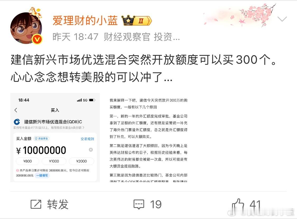 昨天我发微博说建信可以买300万。今天收盘后立马就恢复了限购1000了。有很多实时资讯不用你们到处找。当然你们也可以把我当笑话当乐子看。总之不白关注。