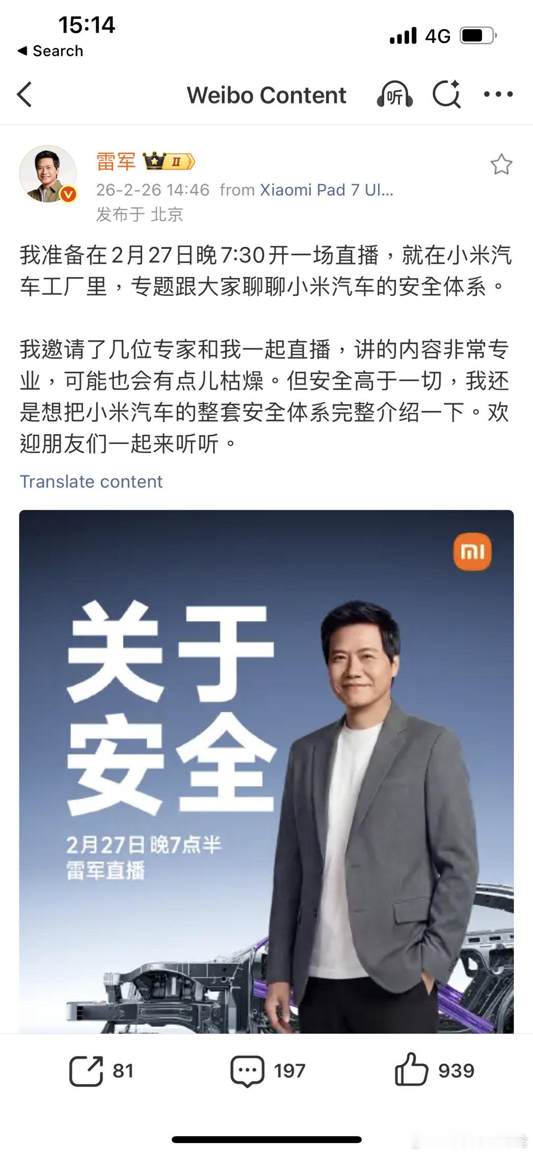 2月26日,雷军官方微博显示:雷军将在2月27日晚上7点半和几位专家直播,讲一讲汽车安全。雷军