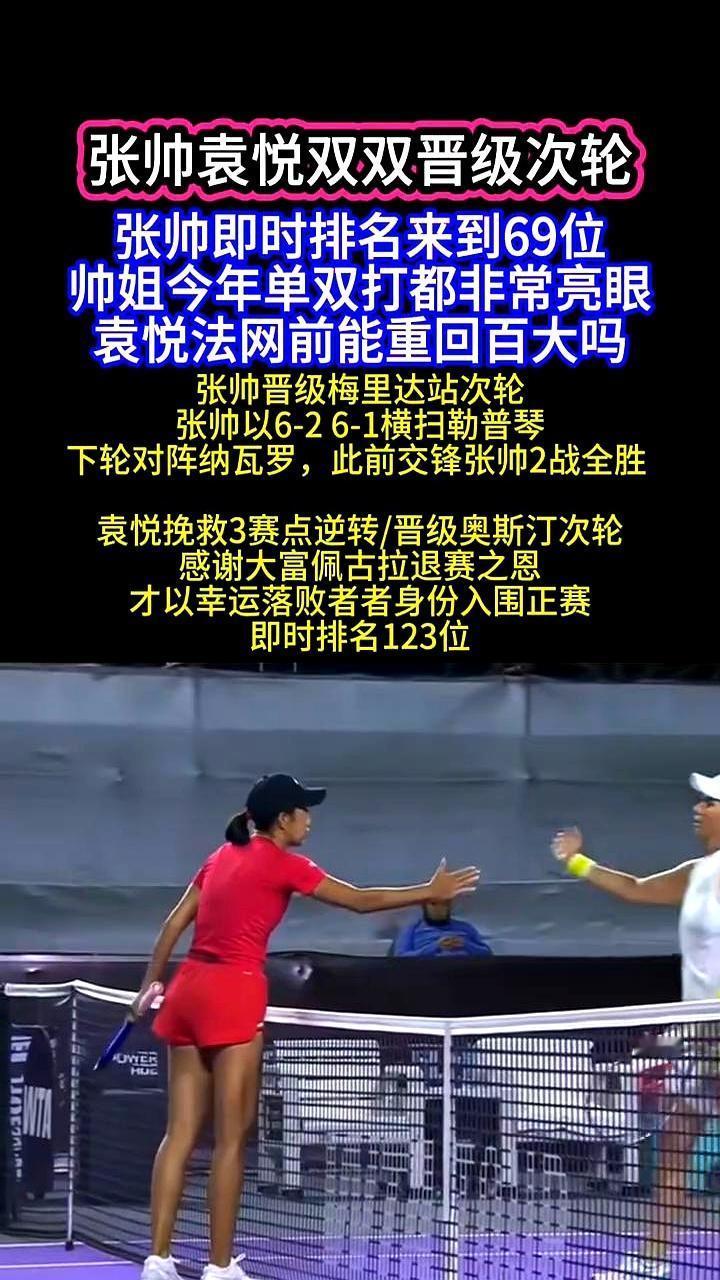 37岁张帅横扫老将,袁悦逆转死里逃生 你敢信?张帅67分钟就把39岁美国老将勒普琴科横扫出局。 她从资格赛一路杀进正赛,连赢4场,即时排名升至第69位。 下一轮对阵赛会2号种子纳瓦罗,她此前两次交手全胜。 换做是你,首盘输球第二盘0-40落后,这口气你咽得下去吗? 袁悦本来资格赛出局,靠佩古拉退赛才以幸运落败者身份入围正赛。 她连救3个赛点破掉对手发球胜局,7-5扳平后6-1横扫决胜盘。 刚又6-3、6-2击败加尔菲,即时排名升至123位。 不是种子才配赢,拼到最后就是赢家。