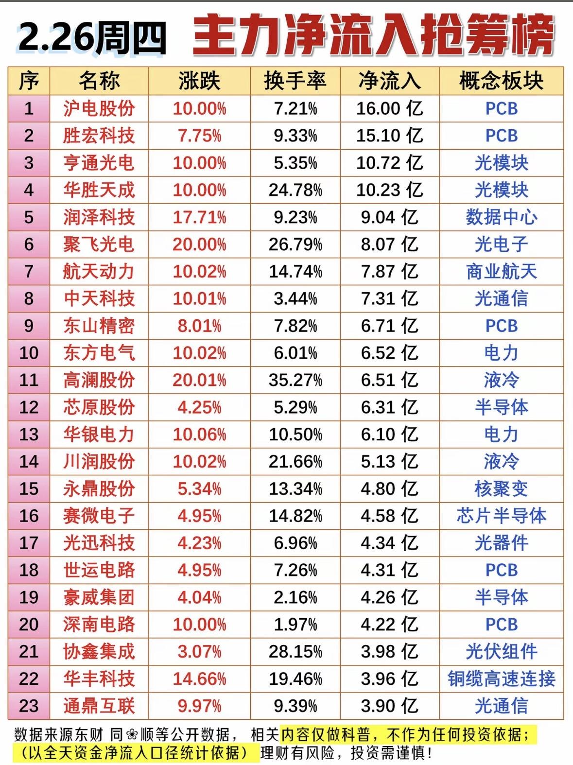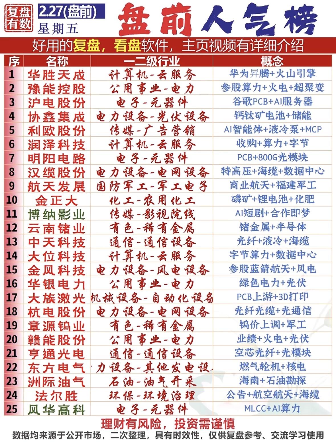 2.27 周五盘前热议人气榜来啦,一起瞧瞧热门股票的魅力!就像东方财富个股人气榜,更新时间是 2026 - 02 - 26 14:24 ,上面有众多股票的排名情况。 看股票人气榜可是有门道的。比如截止 4 月 30 日下午两点半的人气榜,和前一天对比,电力板块没了,消费板块减少,而机器人和算力板块增多。这其实暗示了市场方向。要是假期有相关利好新闻催化,反弹可能变反转;就算没有,至少也会有反弹。从 4 月中旬开始的内循环大消费,或许要高位退潮。所以,多关注人气榜的变化,能让我们更好把握市场动态,说不定还能抓住投资机会呢!