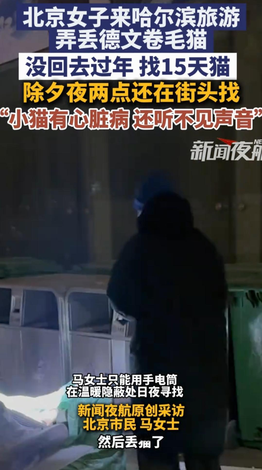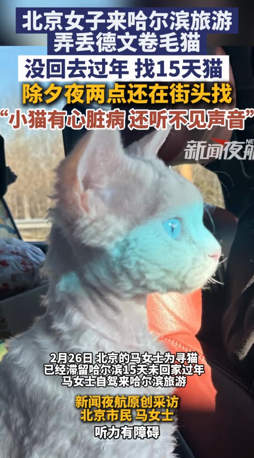 泪目!女子旅游弄丢猫,滞留15天不回家过年:它是家人,我不能丢下它 春节,本该是万家团圆的日子。一位北京姑娘马女士,却在零下十几度的哈尔滨街头,整整找了15天猫,放弃回家,除夕夜凌晨两点,还在寒风里拿着手电一遍遍呼唤。 她自驾带猫咪出游,小猫不慎从后备箱走失。这只德文卷毛猫,先天失聪、还有心脏病,听不到呼唤,也扛不住严寒,在陌生城市里,每多待一天都危险。 别人劝她:过年先回家吧,一只猫而已。可她坚定摇头:它不是宠物,是我的家人。别人过年吃团圆饭,她啃着面包、走遍街巷停车场;别人守岁看春晚,她在寒风里蹲到深夜。自己本就有听力障碍,异地沟通格外艰难,可她从未想过放弃,悬赏4000元,发遍全网求助,不放过任何一条线索。 15天,风餐露宿,心急如焚。她用行动告诉所有人:生命不分大小,承诺重于一切。 这世上最珍贵的,从来不是一时兴起的喜欢,而是不离不弃的担当。不抛弃、不放弃,对一条小生命拼尽全力负责,这就是最朴素的善良。 愿每一份坚守都有回响,愿小猫早日平安回到主人身边,这对迟来的“家人”,能补上最温暖的团圆。猫丢失