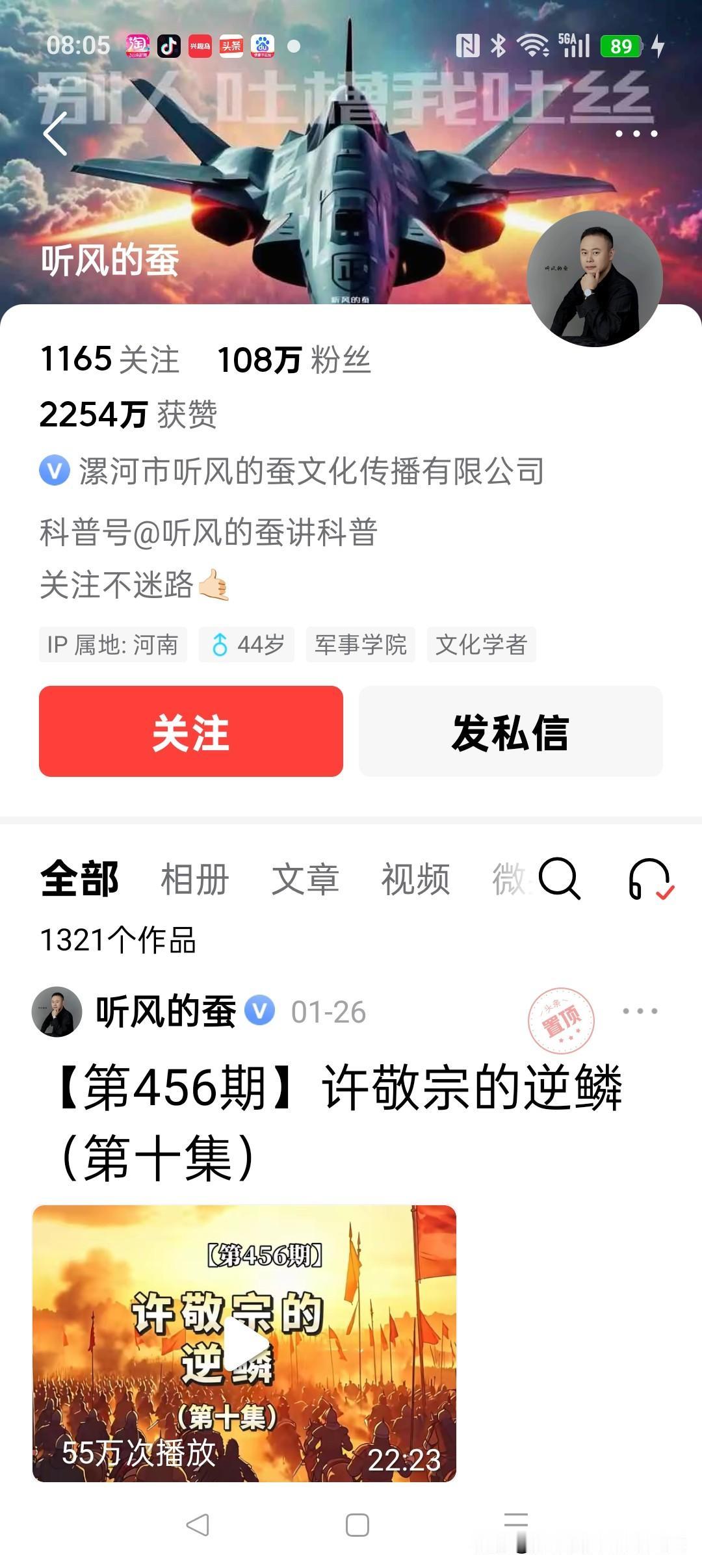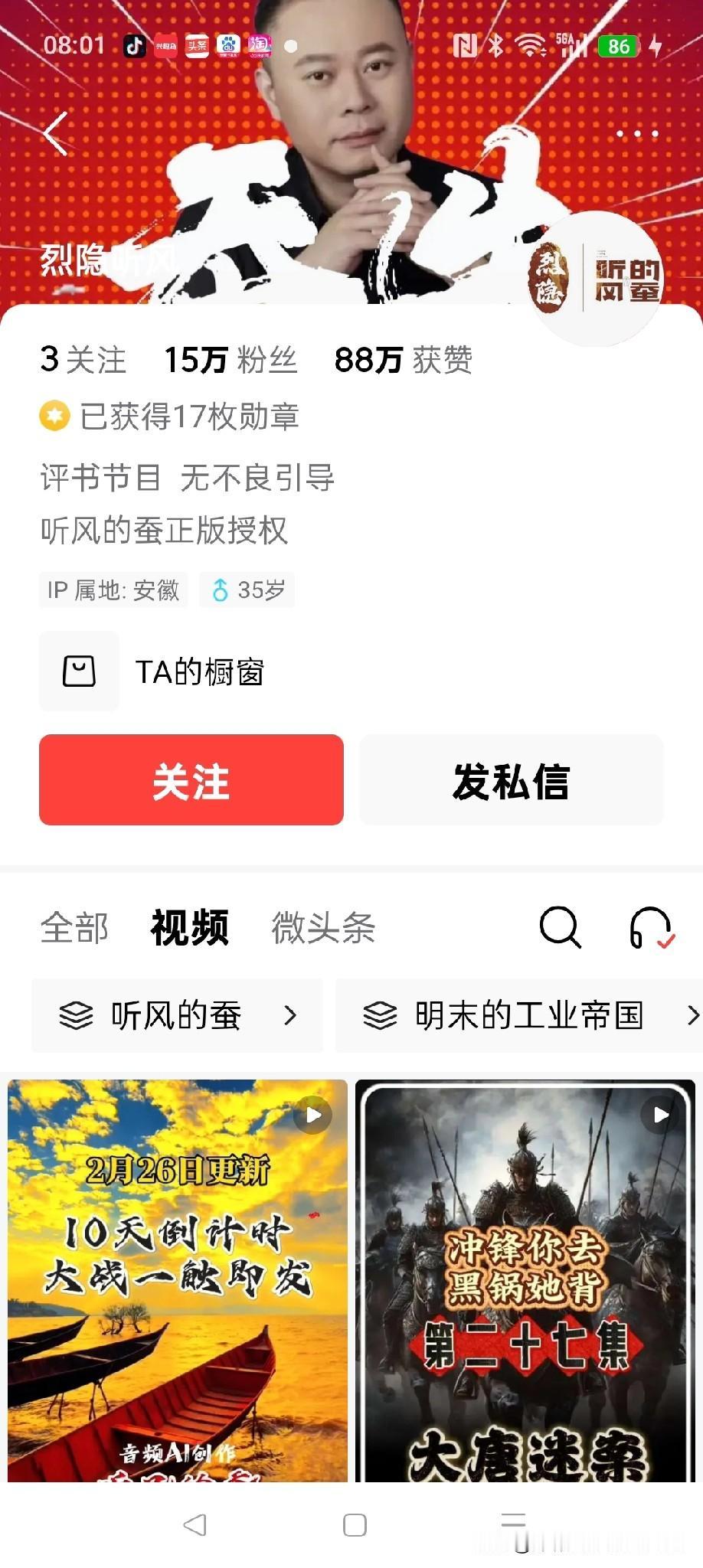 10天前看到听风的蚕的一个新号,好多网友留言说关注了,但粉丝还是15万没变。 莫非这不是朱唯一的账号,可是那个讲刘仁轨的大唐迷案一直在更新,10天前是23集,现在讲到了27集,而听风的蚕的头条号、微信号、抖音号的大唐谜案统统都停留在第10集。 而头条号的粉丝倒是涨了一万,从107万涨到108万。 这个烈隐听风到底是不是听风的蚕,如果不是,怎么只有这号在更新大唐谜案,还有带货还有他在节目中说,网上说他被封号的原因都不对。 但听风的蚕的运营团队并未解散,听风基地公众号,一直在更新。