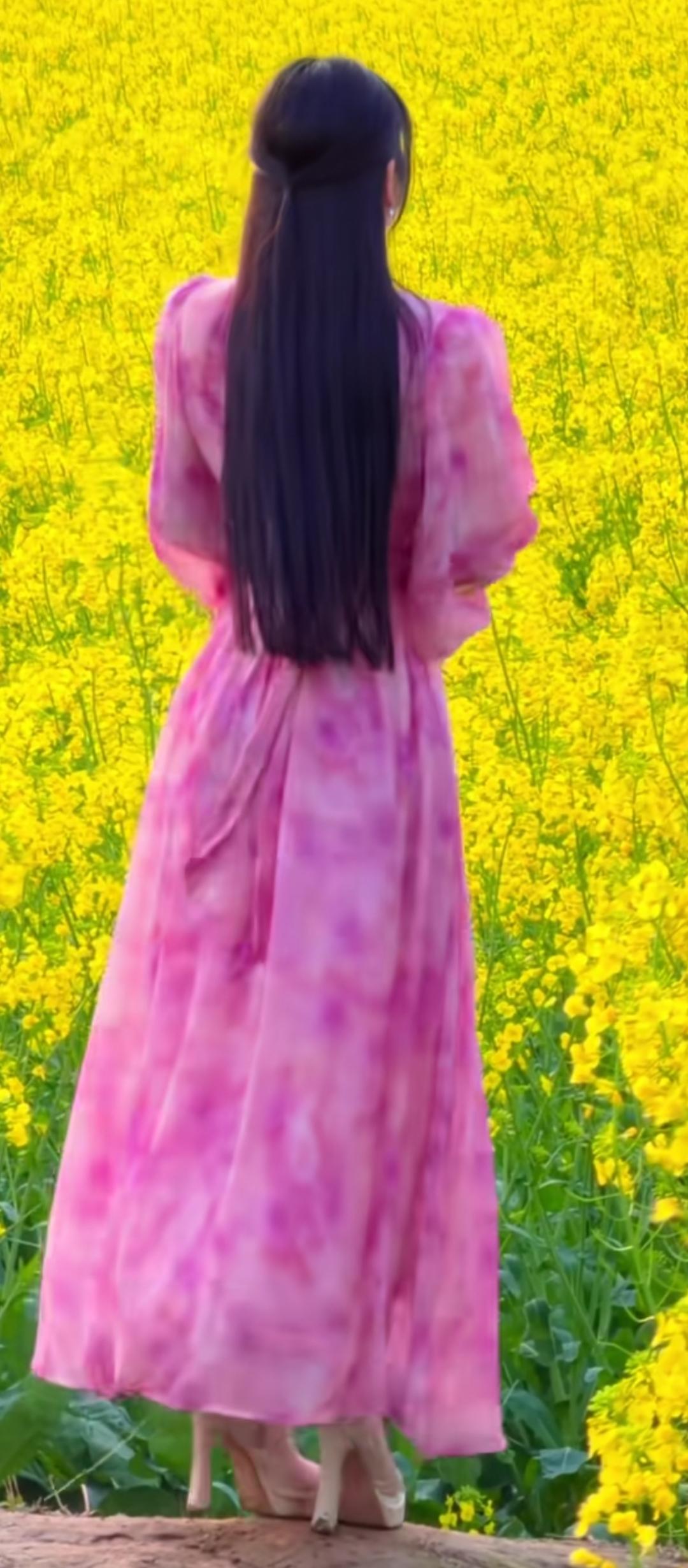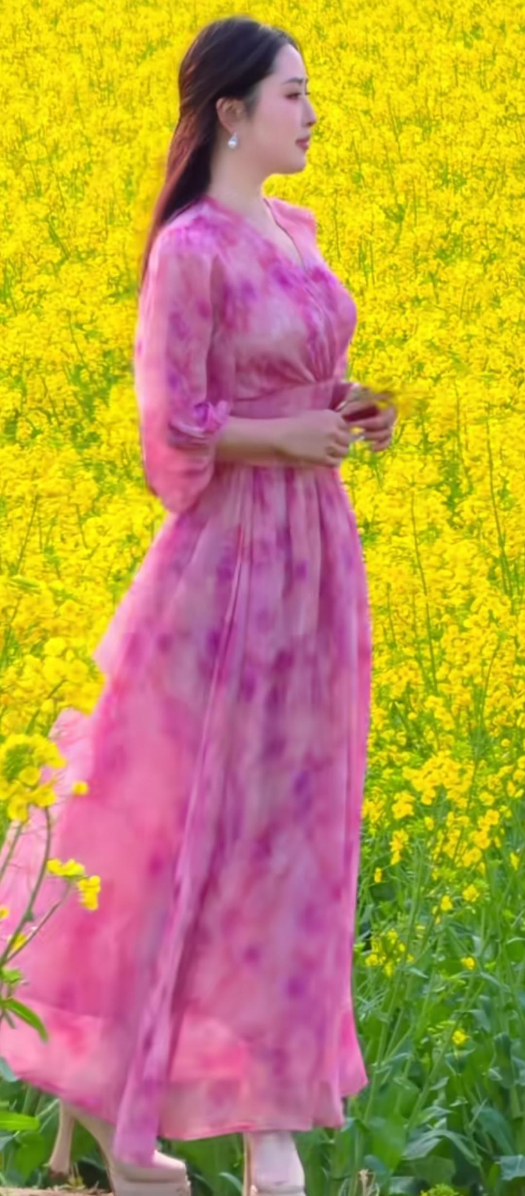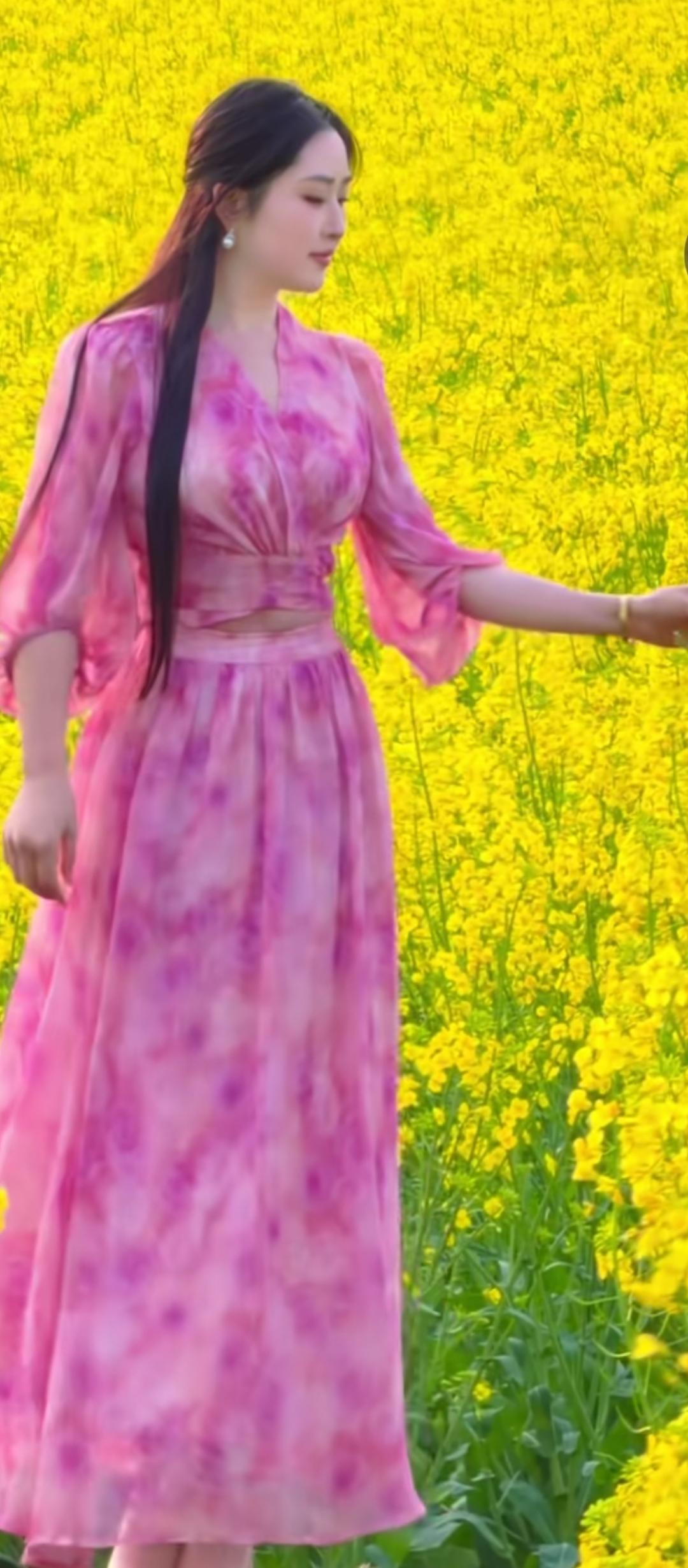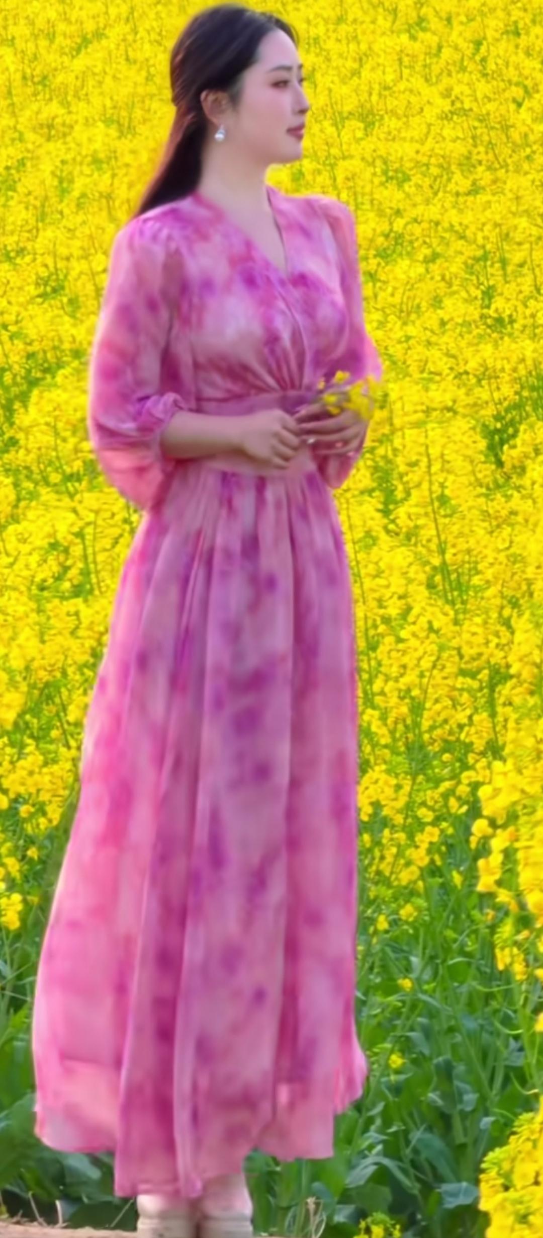 粉紫色连衣裙,置身油菜花海,春日浪漫气息扑面而来!🌸🌼