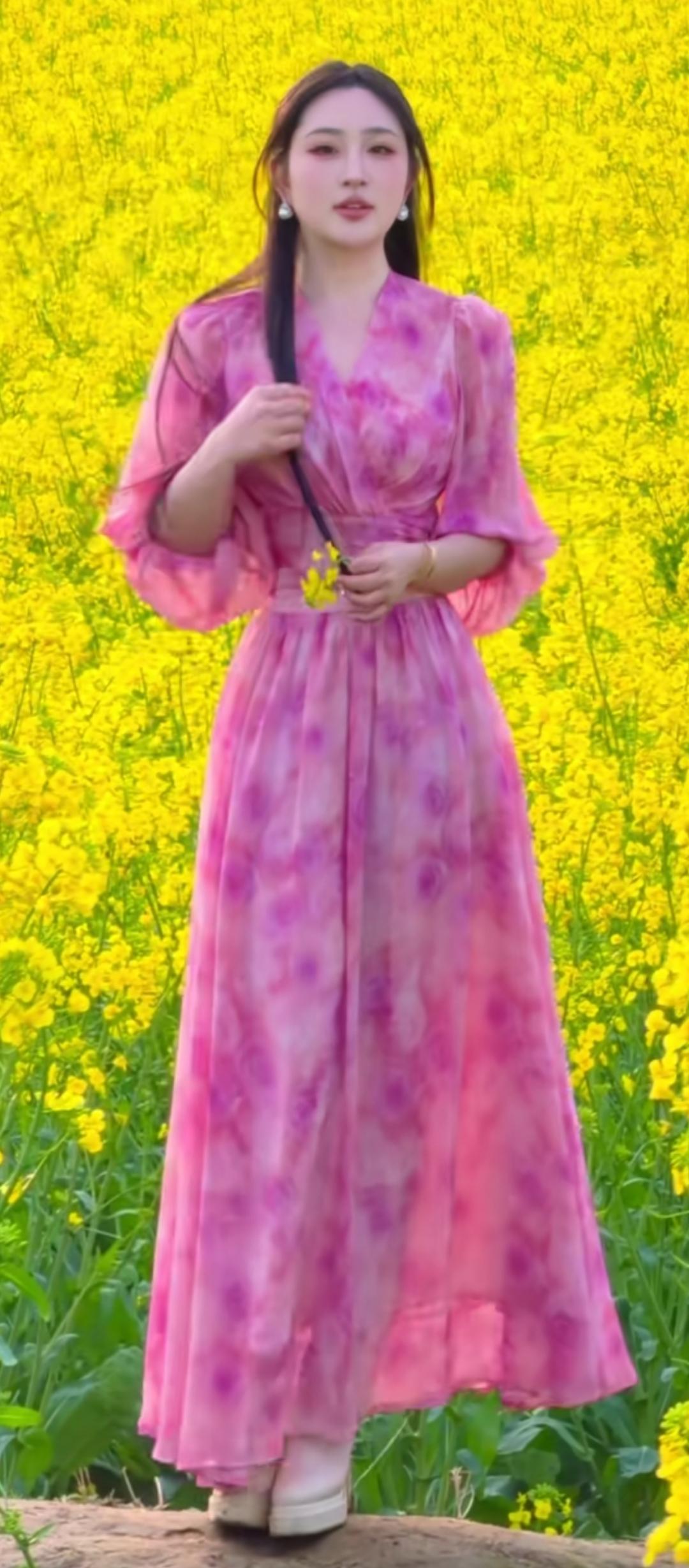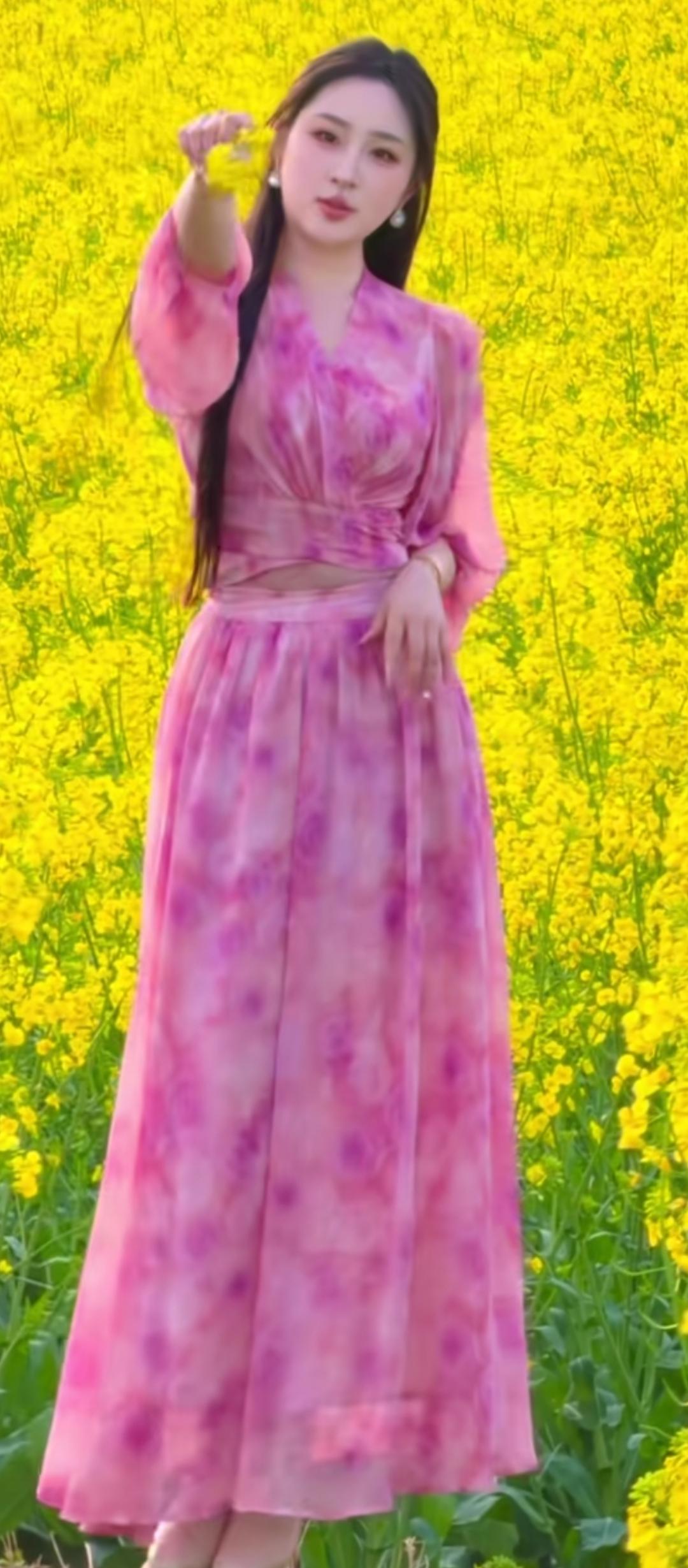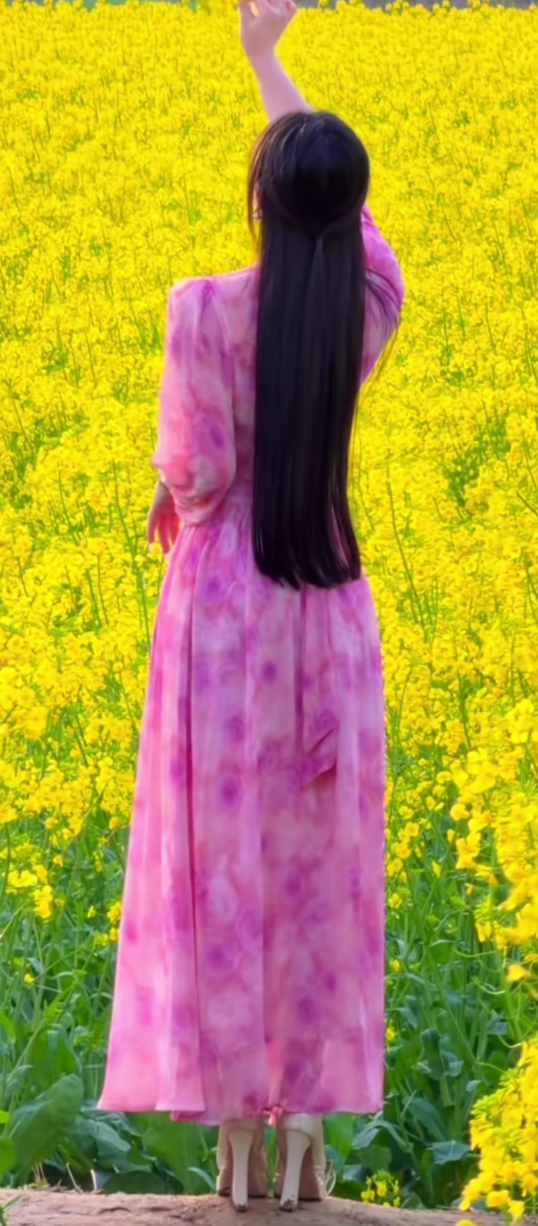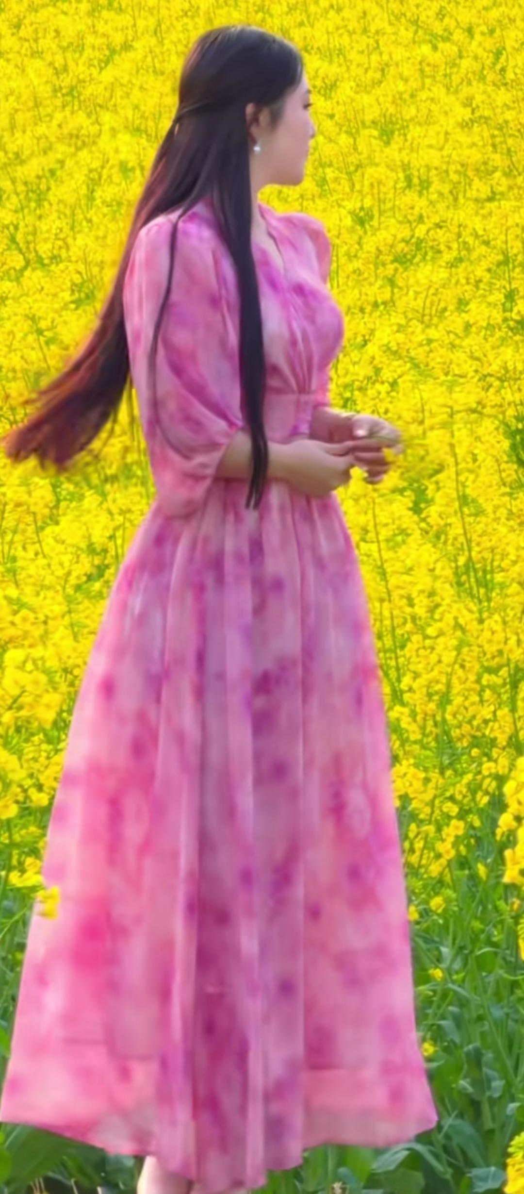 粉紫色连衣裙,置身油菜花海,春日浪漫气息扑面而来!🌸🌼