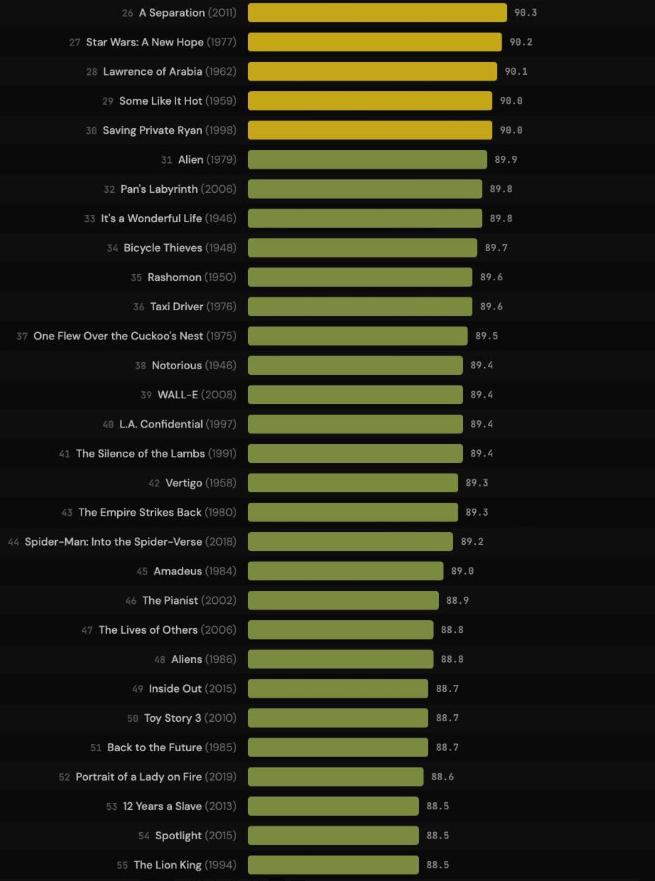 【一位 Reddit 用户根据 IMDb、烂番茄、Metacritic 和 Letterboxd 等主要影评聚合网站的评分,整理出了有史以来最伟大的100部电影。 】他们将所有评分标准化为单一标准,并根据最新分数更新排名,从而得出最新榜单。 前十名如下: 1.《教父》(1972) 2.《十二怒汉》(1957) 3. 七武士 (1954) 4.《辛德勒的名单》(1993) 5.《卡萨布兰卡》(1942) 6.《后窗》(1954) 7.《千与千寻》(2001) 8.《雨中曲》(1952) 9.《教父2》(1974) 10.《萤火虫之墓》(1988)