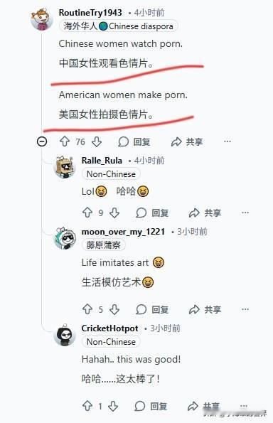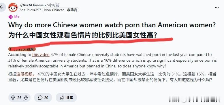 外网:为何中国女性观看色情片的比例高于美国女性? 中国女大学生一年内观看色情片的比例为47%,美国女大学生是31%,相差16%。 评论区的回应十分精彩: 中国女性观看色情片,美国女性拍摄色情片 这回复相当机智,一针见血。 是啊,你们都亲自参与拍摄了,哪还用得着看。 我们这边女性观看比例高,那是为了进行艺术观摩。 外网网友整天无所事事,不做正事,净琢磨这些事儿。 也不清楚这个比例是如何调查出来的,美国31%的比例可信度较高,毕竟以美国人的性子,问她们这个问题,她们大概率会如实相告。 中国的那个比例不可信,采访100个人,能有一个说实话就不错了。 况且也没说明这些数据是在国外采集的还是国内采集的。 总之这就是闲聊,别太较真,当个乐子看看就行。