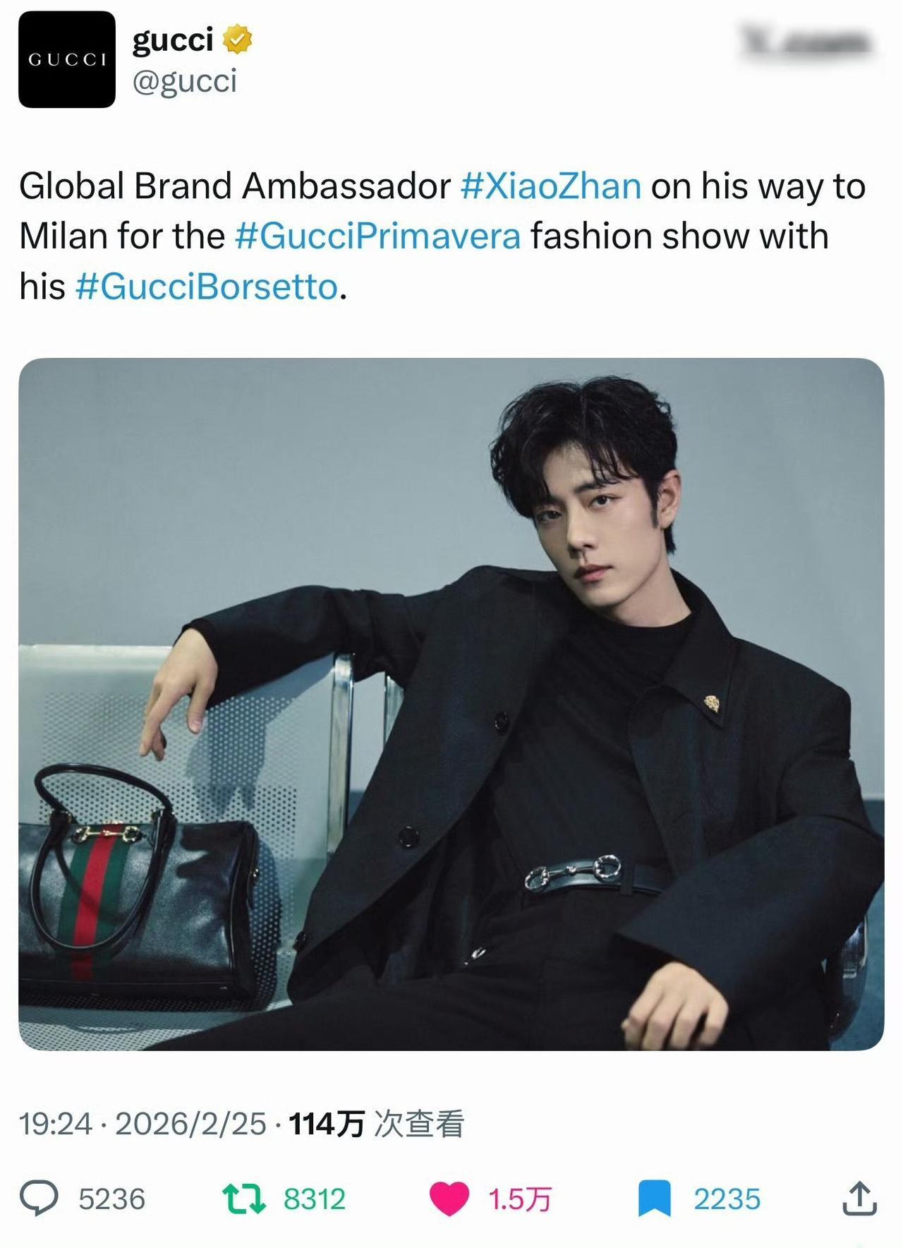真别比了,在肖战这儿,时装周就没有“被压待遇”这一说。新总监上任首秀,Gucci直接把内娱唯一名额给了他,海内外全平台官宣首发只放肖战,这偏爱都写在脸上了。从头到尾顶格安排,头排主位、专属礼遇拉满,不靠蹭不靠挤,凭实力稳站C位。没办法,星光够亮,品牌才会这么宠,这就是顶流的底气,内娱独一份的排面!