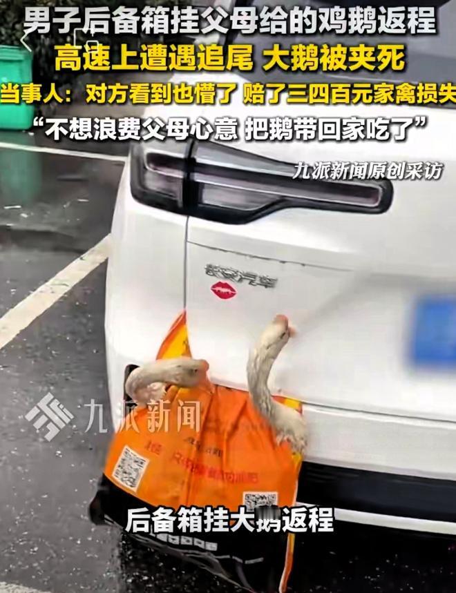 “太惋惜了!”湖北襄阳,一男子开车返程上班,后备箱外挂着父母准备的鸡和鹅,不料途中遭遇追尾事故,几只家禽全都丧命,看着父母的一片心意付诸东流,男子心疼不已,所幸追尾车主最终赔偿了三四百元的损失! 春节返程的高速上,有人载着满车年货奔赴远方,有人却载着父母的满心牵挂,遭遇了一场哭笑不得又满心遗憾的意外。 湖北襄阳的胡先生,就经历了这样一场“赔了家禽又闹心”的返程插曲,三四百元的赔偿款到手,却怎么也高兴不起来——那可是父母攒了大半年的心意,转眼就成了泡影。 2月24日,胡先生收拾好行囊,从襄阳老家出发,驱车返回广东上班。 临走前,父母往他车里塞东西的架势,像极了所有中国父母的模样,自家院子里养了大半年的4只鸡和鹅,硬是要让他带上,说城里买的不如家里养的鲜香,能补补身子。 胡先生既感动又犯愁,活禽放密闭的后备箱,跑几百公里肯定会闷死,辜负了父母的一片心意。 琢磨来琢磨去,他想出了个“权宜之计”,找了结实的绳子,把4只鸡鹅牢牢挂在后备箱外侧,想着这样通风透气,既能保住活禽,也能带着父母的牵挂上路。 一路小心翼翼,胡先生按着导航稳步前行,眼看着距离广东的目的地只剩300公里,行驶到湖南永州境内时,意外毫无征兆地发生了。 后方车辆未保持安全车距,刹车不及,“砰”的一声狠狠撞在了他的车尾,剧烈的撞击力瞬间传遍车身。 胡先生心头一紧,赶紧下车查看,眼前的场景让他又气又心疼,车尾被撞得有些变形,更让人揪心的是,挂在后备箱外侧的4只鸡鹅,刚好处于撞击的核心位置,早已没了动静,其中一只鹅还被牢牢夹在两车之间,模样着实可怜。 后车车主下车后,看到这一幕也懵了,站在原地看了半天,估计也是头一回遇到追尾撞死家禽的情况。 没有争吵,没有推诿,双方很快冷静下来,胡先生第一时间报了保险,处理车辆维修事宜,而后车车主作为全责方,也主动承担了家禽的损失,协商后赔偿了三四百元。 事故处理完毕,胡先生看着死去的鸡鹅,心里满是惋惜,这4只家禽,是父母省吃俭用养出来的,平时自己都舍不得吃,特意留给他补身体,如今却因为一场意外付诸东流。 思来想去,他没舍得扔掉,把还能食用的鹅带回了广东,也算没完全浪费父母的心意。 后来胡先生把这件事告诉了父母,让他暖心的是,父母的第一反应不是心疼鸡鹅,而是反复询问他有没有受伤,叮嘱他以后开车一定要注意安全,那一刻,胡先生才明白,比起这些家禽,父母最牵挂的从来都是他的平安。 这场小意外,也给所有返程车主提了个醒:后备箱外挂活禽,不仅违规,还藏着不小的安全隐患,既可能引发事故,也可能让父母的心意白白浪费。 亲情可贵,但安全更重要,返程载物,合规出行,才是对自己和家人最好的负责。