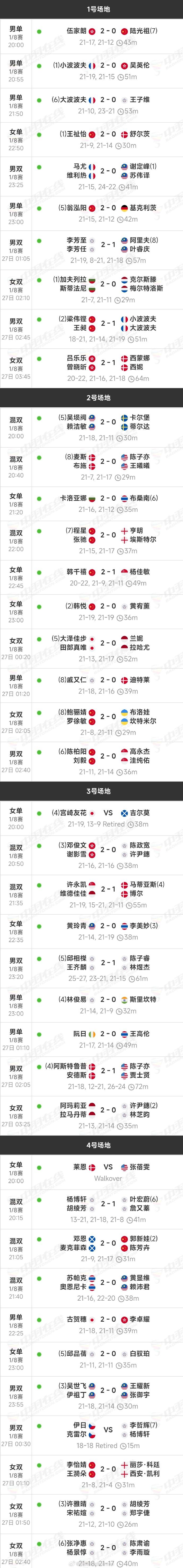 2026德国赛 16进8国羽9胜2负,小陆2局脆败伍家朗 2026年德国羽毛球公开赛,昨天结束了第3个比赛日的争夺,即16进8。国羽战绩9胜2负,输球场次来自男单和混双。小陆首轮逆转击败苏力扬后,本以为能延续好状态,没想到第2轮就0比2不敌伍家朗,止步16强;另一场输球是郭新娃/陈芳卉,去年的全英赛冠军,不知道今年能不能卫冕成功,赶快调整状态咯。 国羽2场输球 伍家朗21-17 21-12陆光祖 邓恩/麦克菲森21-9 21-17郭新娃/陈芳卉 赢球场次中,梁王的最为刺激。他们和波波夫组合打满3局,决胜局21比19取胜;其实还有一场比赛也值得一提,女单韩千禧2比1击败杨佳敏,小花们赶紧参加比赛吧,早点打出来。雨菲已经撑了2个奥运周期,太辛苦了。 韩千禧 20-22、21-9、21-11 杨佳敏 梁伟铿/王昶18-21 21-14 21-19小波波夫/大波波夫 国羽8强名单 男单:翁泓阳 女单:王祉怡、韩千禧、韩悦 男双:陈柏阳/刘毅、梁伟铿/王昶 女双:鲍骊婧/罗徐敏、李怡婧/王漪朵 混双:程星/张驰 外协会场次中,最冷门的是大马男双组合谢定峰/苏伟译,他们是1号种子,就止步16强。完整赛果看图片吧