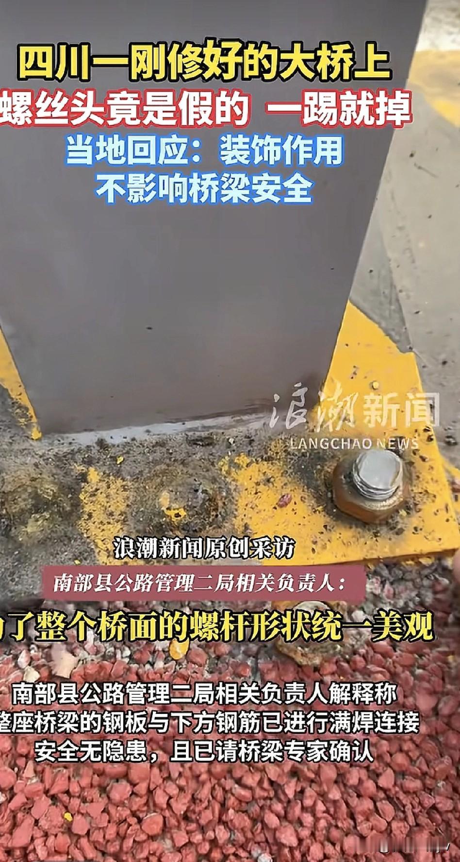 惊掉下巴! 四川一座刚修好的大桥上,螺丝头居然是假的? 官方回应:起装饰作用,不影响质量安 全。 并请专家鉴定过! 公众质疑:既然下面已经满焊,锚固, 为什么上面还要贴上这些不起作用的螺丝? 大桥主要是安 全第 一,其次才美观大方。 一踢就掉是为了好看? 这些装饰螺丝不仅没起到美观作用,反而让人觉得不安 全。 莫非里面有隐情? 一座投资上亿的大桥,得花多少钱买装饰螺丝啊, 真是生财有道!