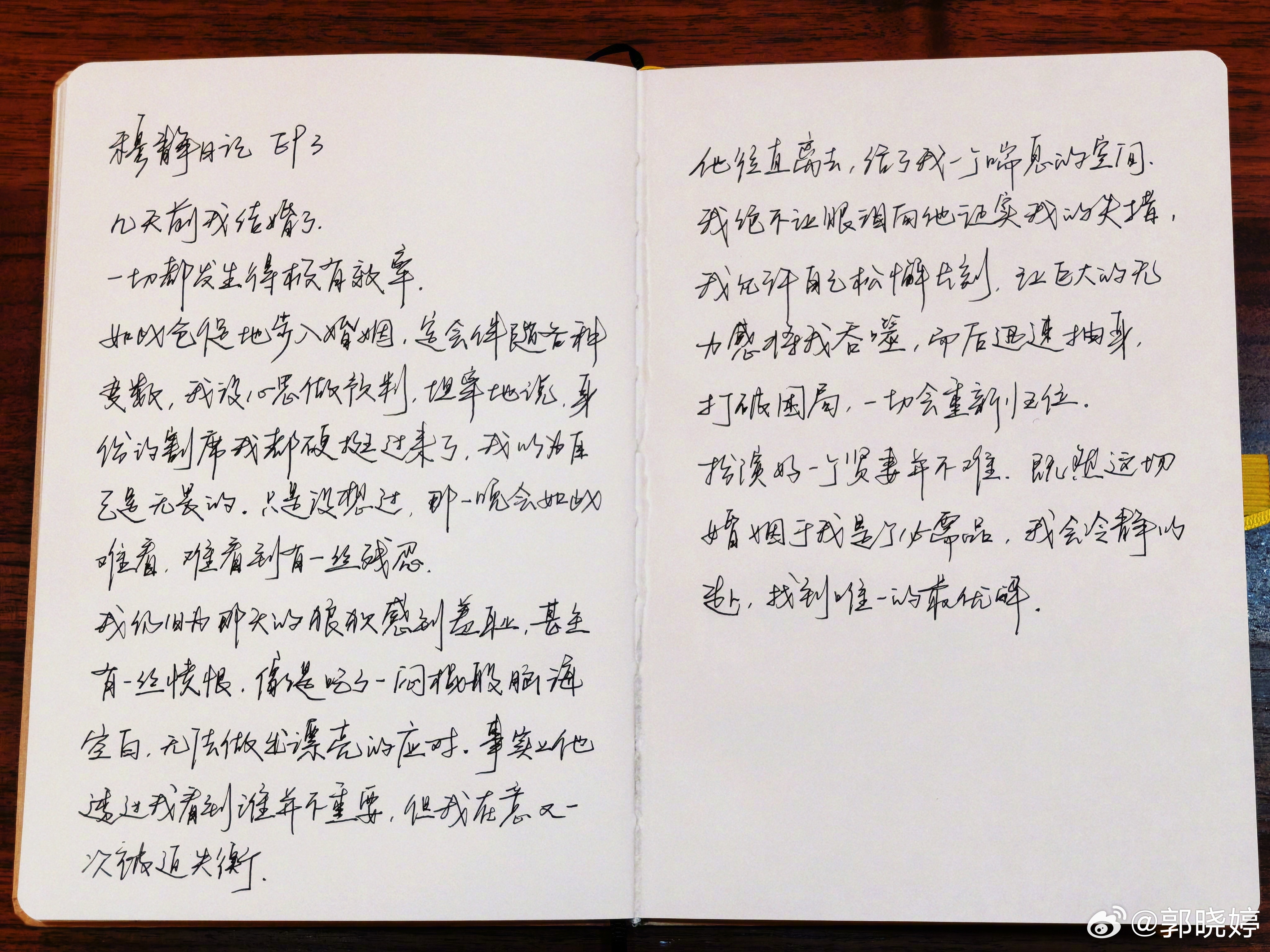 #方穆静日记#【#方穆静的婚姻最优解#】近日,演员郭晓婷在社交平台晒出剧中角色方穆静的手写日记,这页带着时代温度的文字,瞬间撕开了七十年代 “契约婚姻” 下的隐忍与清醒。日记里的方穆静,是那个年代里罕见的 “人间清醒”。她出身寒门却智商超群,为了摆脱家庭成分的桎梏,选择与高干子弟瞿桦(王天辰 饰)开启一场各取所需的婚姻。这场始于算计的结合,让她在新婚之夜便感到 “羞耻与愤恨”,而丈夫瞿桦的径直离去,更给了她喘息的空间。“扮演好一个贤妻并不难。既然这场婚姻于我是个必需品,我会冷静地选,找到唯一的最优解。” 方穆静的理性与克制,戳中了无数观众。在那个纯真又压抑的年代,她用数学公式般的精准规划人生,却在瞿桦不动声色的守护中,逐渐动摇了自己的防线。这页手写信不仅是角色的内心剖白,更是《纯真年代的爱情》对时代情感的精准复刻。当 “先婚后爱” 的设定遇上七十年代的特殊语境,当理性的算计遭遇汹涌的真心,这段关系最终将走向何方?#纯真年代的爱情#(图源演员郭晓婷微博)
