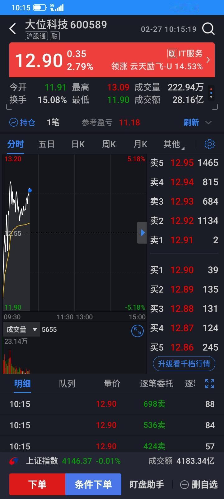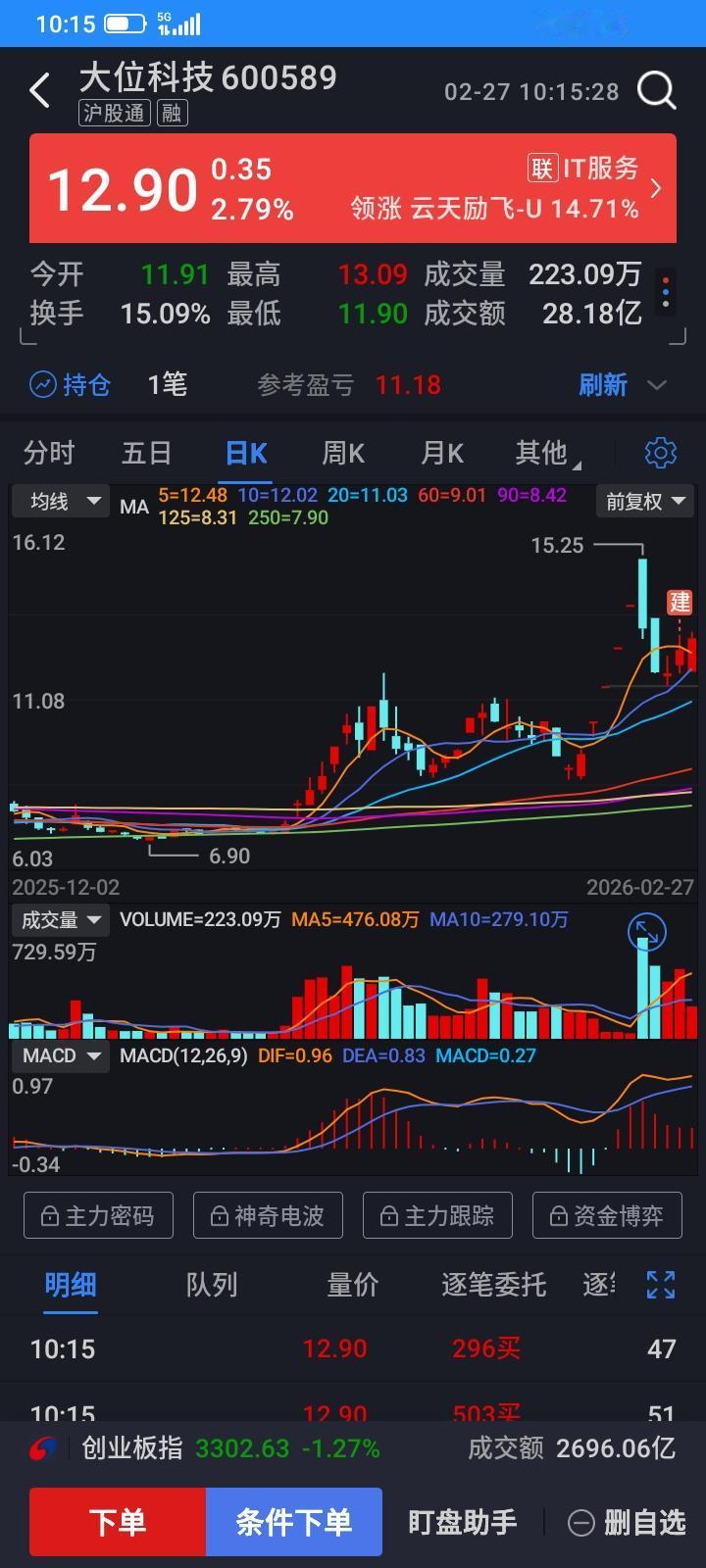 撑死胆大的饿死胆小的,胆小了,又被主力成功的预判我的止损点,昨天浮盈5个多点,浮盈60多块钱,但是赌徒只有离开赌场,留在口袋里的钱才是自己的,先赚再多都是浮云,我设置了百分之5的止损单,止损价11.91元,今天开盘就大跌5个点,正好击穿我的止损点,集合竞价就触发了止损单,自动委托11.91止损卖出,9.30以12元成交了,马上就上涨了,赚再多没有卖出都只是浮盈,空欢喜一场,又被成功洗出来了,还好没有亏钱,就当昨天没有买这只股票吧,给自己一个理由,自我安慰一下吧。