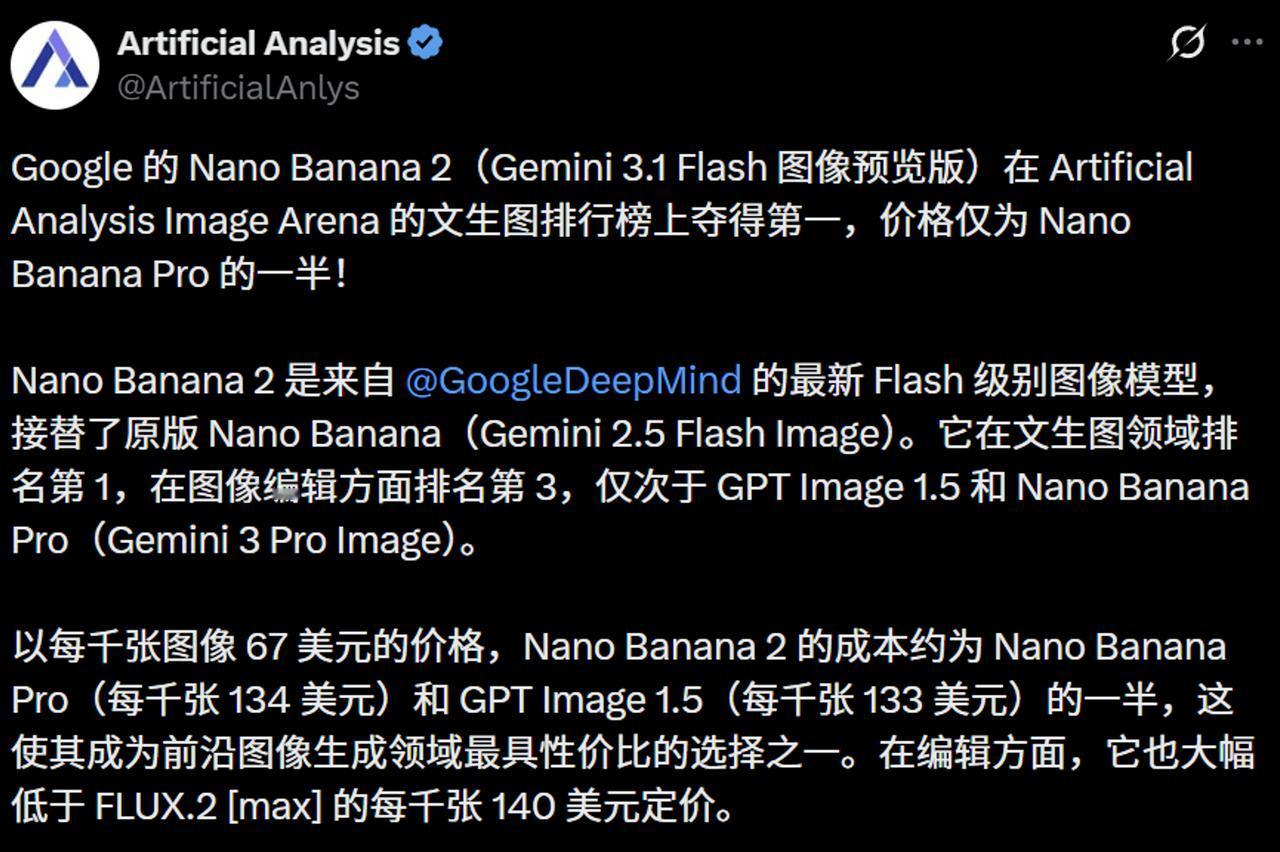谷歌正式发布基于 Gemini 3.1 Flash 的 Nano Banana 2,实现了Pro 级画质与 Flash 级速度的完美平衡。它不仅将生图成本直接砍半,更通过接入实时搜索和增强逻辑推理,彻底解决了 AI 生图“文字乱码”和“缺乏常识”的顽疾。 💎 关键点 1️⃣ 问鼎全球文生图榜首:在 Artificial Analysis 等多项权威测评中超越 GPT 和自家 Pro 版,证明了“小模型”也能出顶级画质。 2️⃣ 自带“世界知识”的思考力:模型生成前会先联网搜索真实参考(如特定建筑或科学原理),确保信息图表和写实场景的准确性。 3️⃣ 工业级的主体一致性:支持单图 14 个对象或连续剧情中 5 个角色特征不变,解决了长篇漫画和视觉叙事中“主角频繁变脸”的痛点。 4️⃣ 极端比例与生产力适配:原生支持 8:1 宽幅和 512px 低延迟模式,配合卓越的文本渲染能力,直接覆盖海报、UI 和广告设计全流程。 🚀 延伸视角 商业降维打击:0.06 美元一张的 4K 成本,意味着专业级视觉产出的门槛被降至地板级,初级美工和素材网站将面临巨大的生存挑战。 Agentic 生图趋势:NB2 证明了生图模型不再是简单的像素堆砌,而是向“理解逻辑-搜索验证-精准渲染”的智能代理(Agent)方向进化。